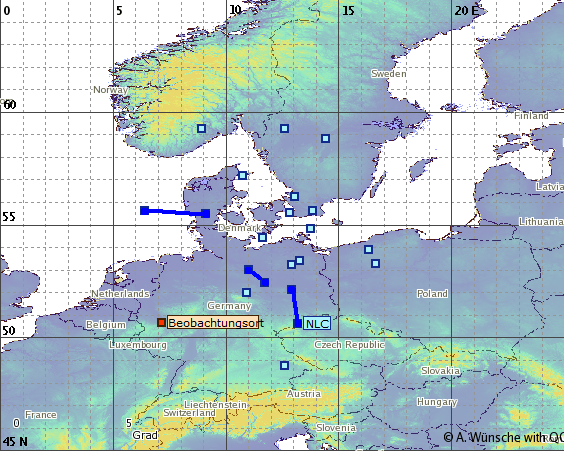 obwohl die Leuchtenden Nachtwolken vom 27./28.06.2018 mitten in der Woche auftraten und sich erst im Morgensektor wirklich gut entwickelten, wurden erfreulich viele visuelle Beobachtungen gemeldet (Abb. 1). Dazu trug sicherlich bei, dass das Wetter sich abgesehen vom Alpenraum und Teilen Bayerns sehr kooperativ gestaltete (Abb. 2). Die Nachkontrolle der Webcams zeigte, dass die NLCs bis an den Alpenrand nachzuweisen waren. Ob dies die tatsächliche Sichtbarkeitsgrenze markiert, muss offen bleiben, da die Webcams weiter südlich wie erwähnt unter Wolken lagen.