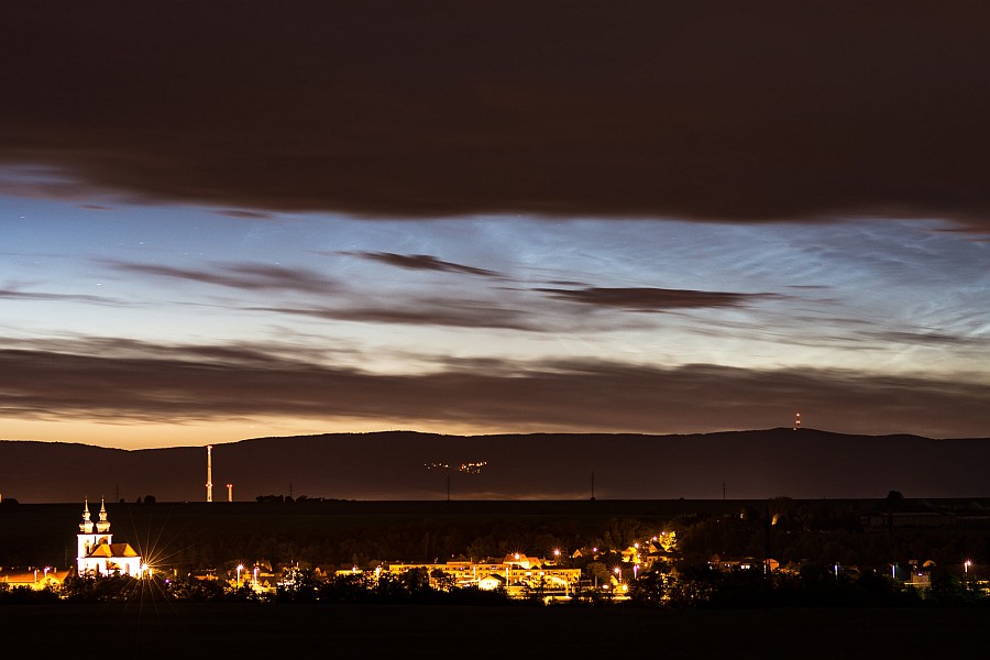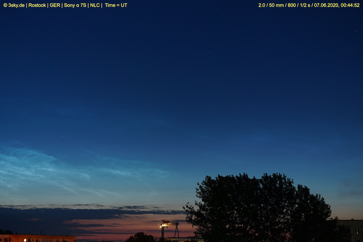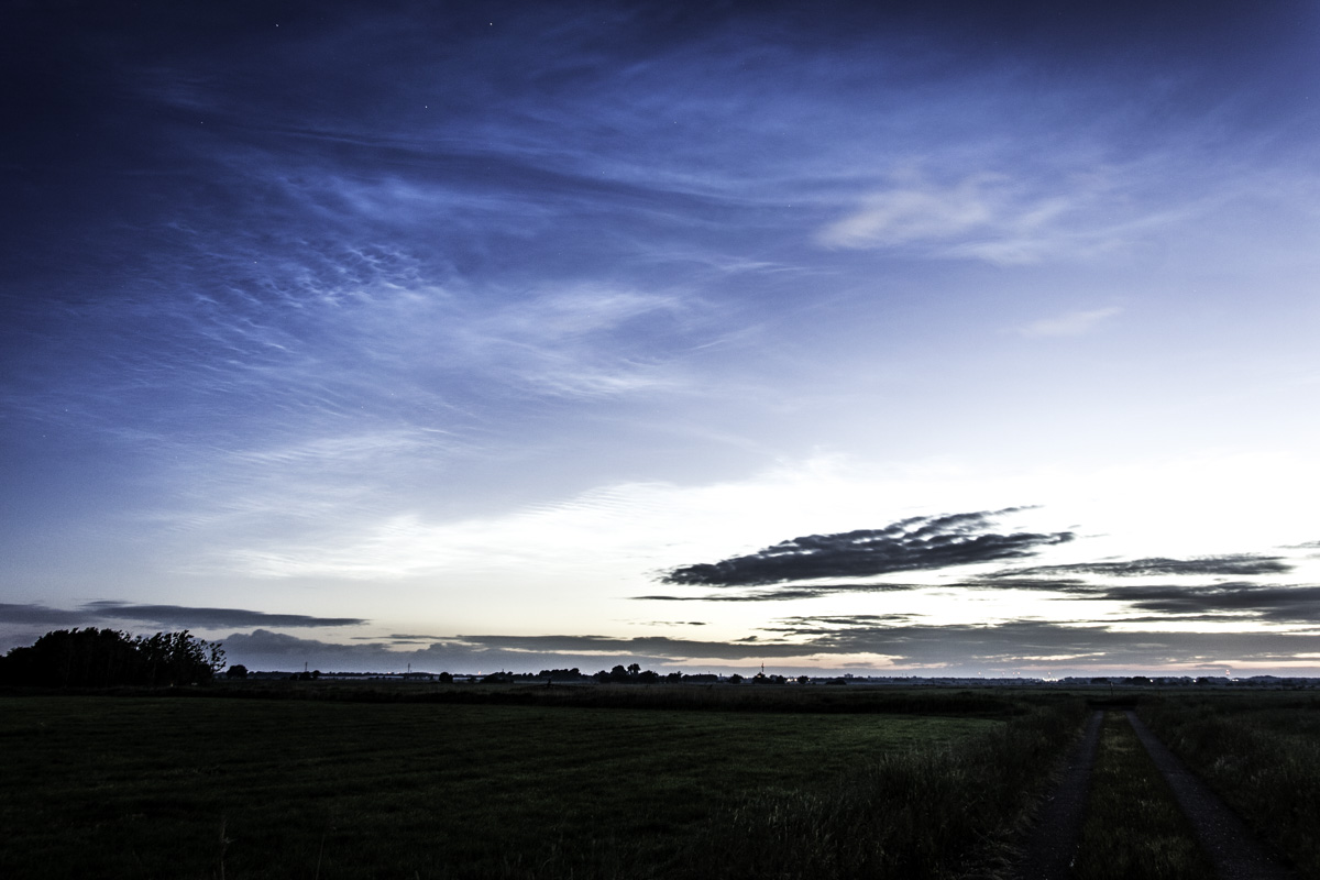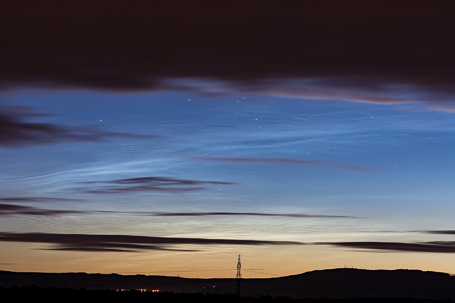 Als ich gegen halb 11 aus dem Haus ging, hingen da noch einige störende Zirren, wobei ich nicht ganz sicher war ob es welche waren. Ein Foto habe ich erstmal nicht gemacht, war ja auch eigentlich noch zu hell. Wenig später hing dann klar ein heller NLC-Streifen mit erheblicher Ausdehnung etwa auf Nordost, ich hatte aber Mühe, gegen die allgegenwärtig übertriebene Straßenbeleuchtung einen guten Blick zu bekommen. Von Westen zog dunkler Stratus auf.