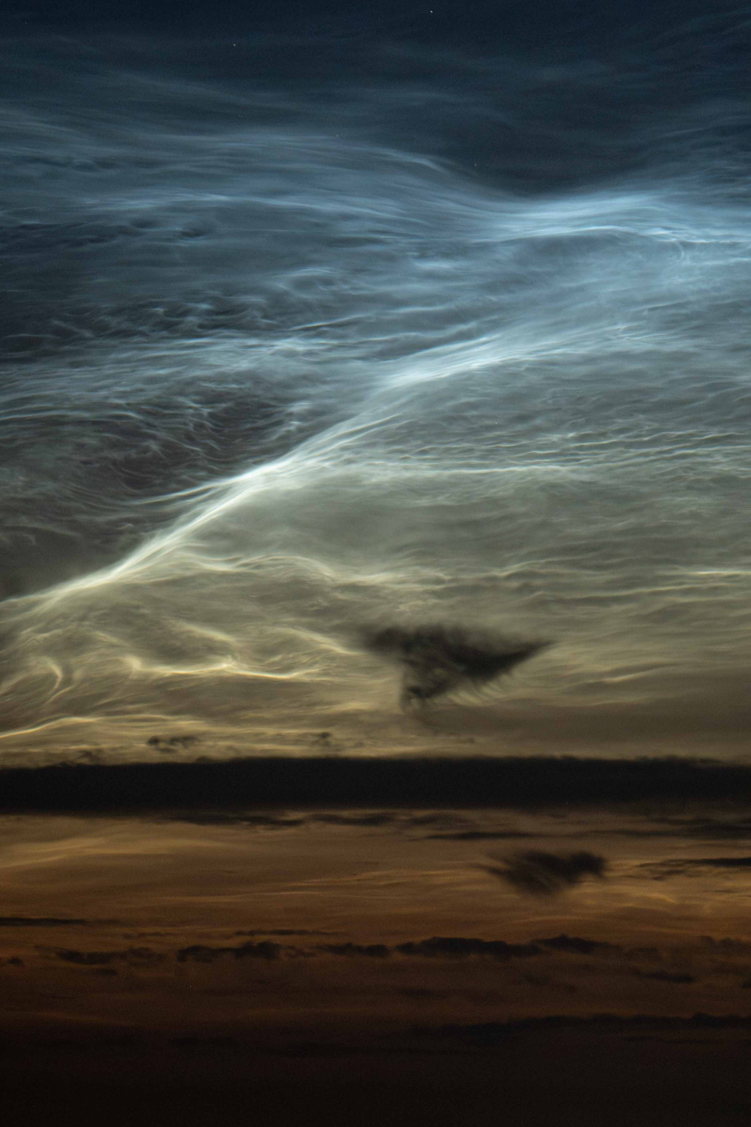 Als Ergänzung zu meinem vorangegangenen Beitrag hätte ich hier noch einen smarten Meteor Richtung Capella, den ich auch visuell wahrnehmen konnte (für die Klassifizierung als Feuerkugel reichte die Helligkeit nicht), zusammen mit tiefstehenden NLCs nachzureichen. Vielleicht haben den auch andere einfangen können: