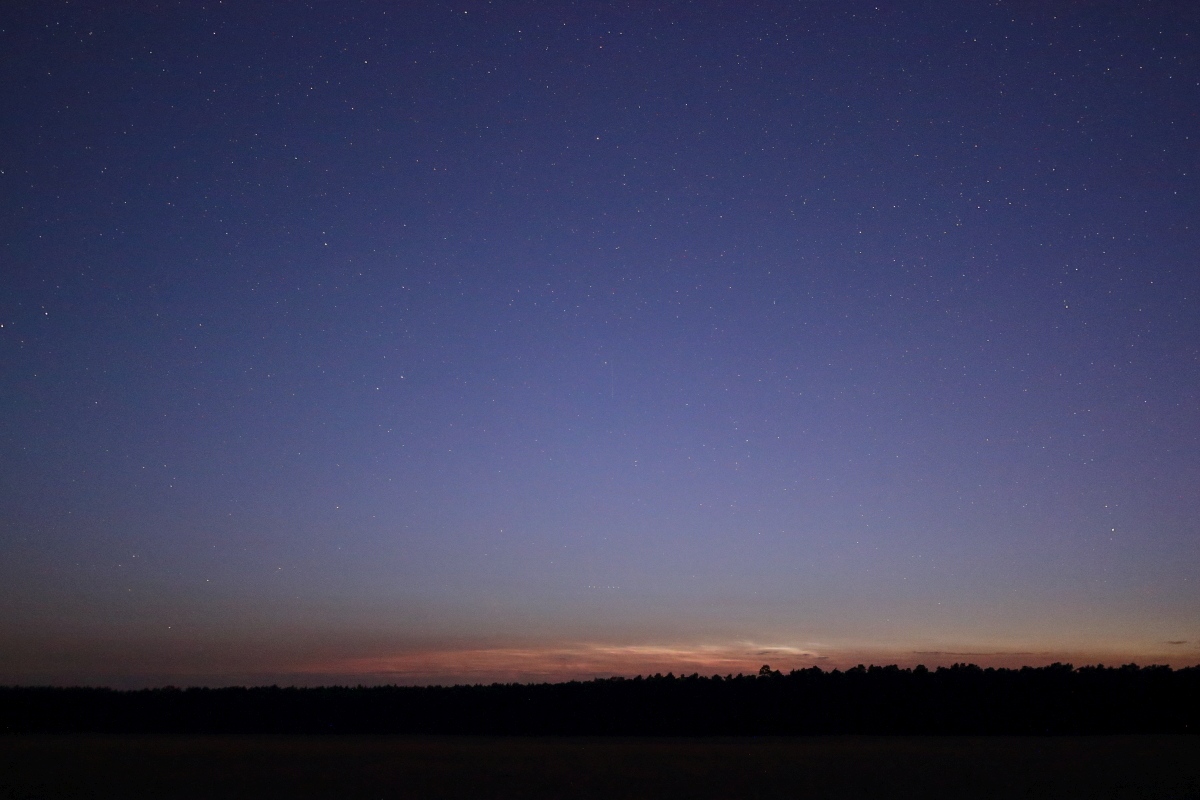 Noch vor Ankunft am Beobachtungsort, wurde ich um kurz nach 22:30 Uhr (MESZ) von den NLCs "überholt" und schließlich auch gestoppt. Bei einem Sonnenstand von ca. -6 Grad, waren die Leuchtenden Nachtwolken nahezu am gesamten Himmel zu beobachten:
