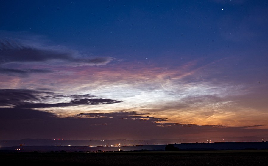 Sommersonnenwenden-Nacht 2019 (exemplarischer Verweis), wenn das nachfolgende Horizont-Display dieses Mal auch nicht ansatzweise so ausgeprägt war. Zum damaligen Zeitpunkt durfte ich die (nahezu) Allsky-Abdeckung der NLCs nur durch enge Wolkenlücken beobachten. Diesmal hat das Rausfahren Abhilfe geschaffen, da die Heimat (45km weiter westlich) auch diesmal nur kleine Wolkenlücken bereithielt. Die Witterungsbedingungen und die Durchsicht waren vergleichbar mit dem Abend des 21. Juni 2019 - was ein Zufall! Doch dieses Mal habe ich nicht den Fehler gemacht und habe unter den Wolken verweilt. (Auch damals hätte eine 70km-Ausfahrt die wahrscheinlich deutlich besseren Sichtbedingungen bedeutet, ich ärgere mich noch heute über meine “folgenschwere” Gelassenheit.)