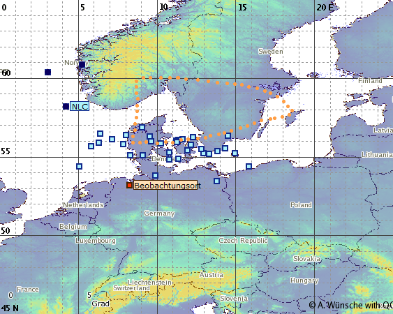 Nach Eingabe aller vorgenannten Positionsdaten in den Kalkulator ergibt sich der Aufenthaltsraum des Südrandes des NLC-Feldes zwischen 22:50 MESZ und mindestens 00:00 MESZ (Abb. 3, hellblaue Quadrate) sowie ab 01:15 bis mindestens 01:40 MESZ (dunkelblaue Quadrate). Zusätzlich ist der Bereich mit orangen Punkten umgrenzt, über dem laut der Positionsrekonstruktion von Michael Theusner das in Schiffdorf beobachtete gesamte NLC-Feld um 23:27 MESZ stand. Insgesamt überdeckten die NLCs am Abend einen großen Bereich zwischen Norddeutschland und Südschweden, in dem sie im Morgensektor nicht mehr auftauchten. Die einzigen Leuchtenden Nachtwolken, welche nach 1 Uhr MESZ noch beobachtet werden konnten, standen weit im Nordwesten vor der westnorwegischen Küste, was auch erklärt, dass sie lediglich von 3 im Nordwesten Deutschlands stationierten Kameras noch erfasst wurden. In diesem Kontext war das ab Mitternacht von mehreren Beobachtern konstatierte rasche Verschwinden der NLCs nicht nur durch die Verschiebung des Terminators nach Norden bedingt, sondern resultierte vor allem aus einer rapiden Auflösung des abendlichen NLC-Feldes. Historisch sind einige beachtliche NLC-Displays bekannt, welche sich gleichsam vor den Augen der Beobachter abgebaut haben (z.B. 19.07.1996 und 27.06.2000)