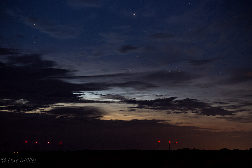 bei uns zogen pünktlich nach Sonnenuntergang Wolken auf - das abendliche Auftreten der NLC kann man gaanz schwach in den horizontnahen Schichten erahnen, wenn man es weiß...