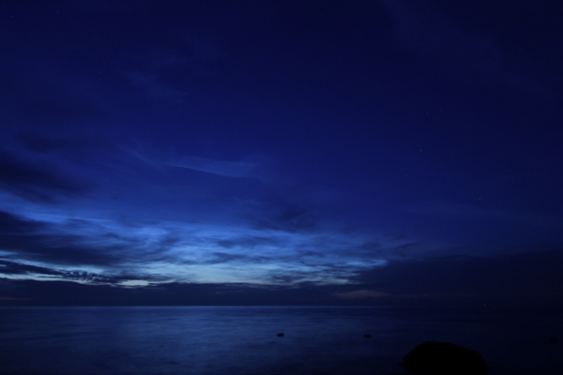 hier in Tröndel/Emkendorf - 54,3°N, 10,5°O -zweite NLC-Nacht hintereinander, siehe Bilder von der Ostseen Steilküste Hubertsberg. Wir waren ca. 21:30 UTC (23:30 MESZ) vor Ort. Zu diesem Zeitpunkt entstand das zweite Foto. Das erste Bild ca. 1:15 h später, also gegen 22:45 UTC, bzw. - NLC ab ca. 0:45 MESZ. Innerhalb dieser Beobachtungzeit zogen sehr schnell - noch mehr - Wolken. Schade. Vllt hätten wir noch etwas länger abwarten sollen, die letzte Nacht war aber auch schon kurz.