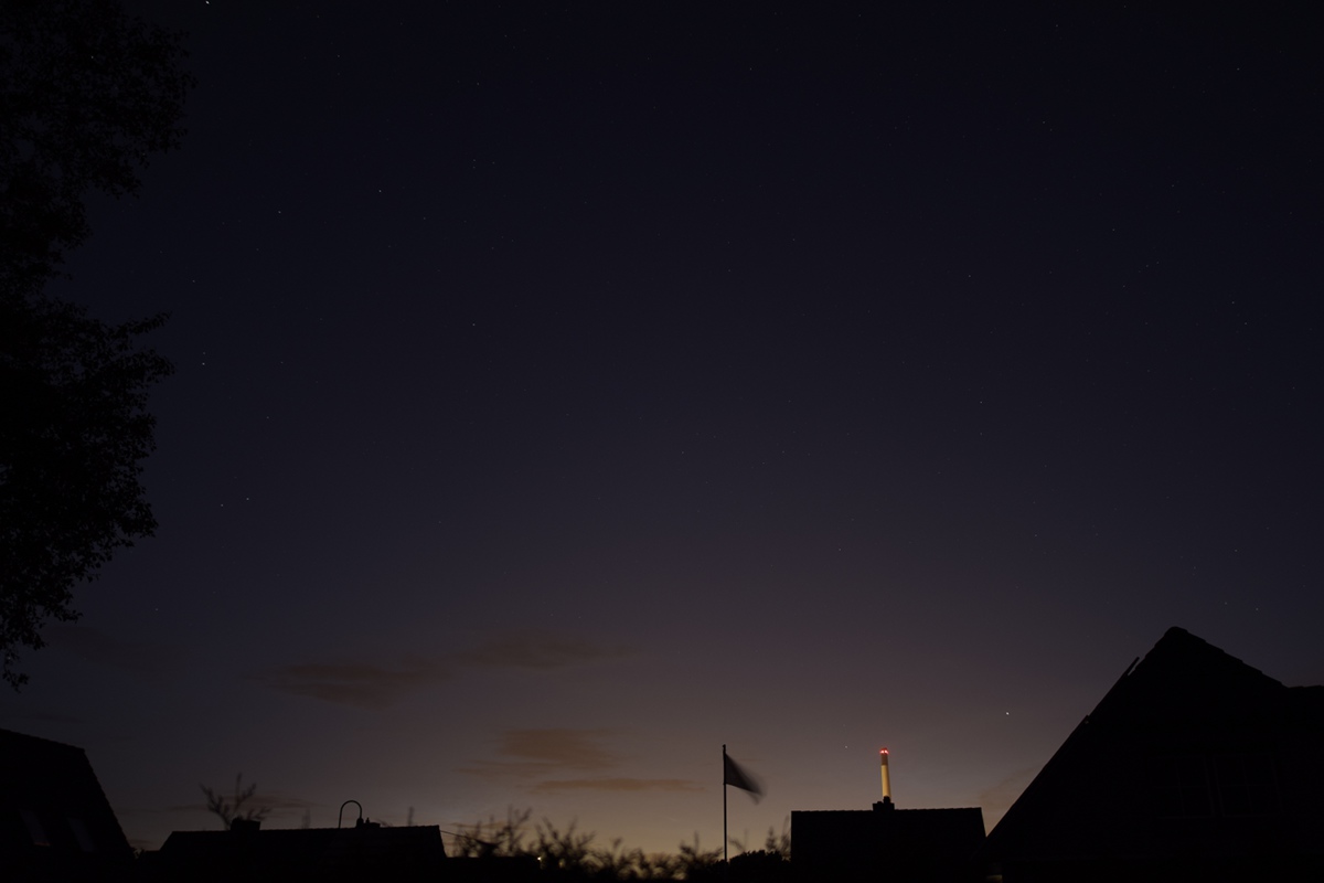 Eigentlich wollte ich einen Iridium-Flare fotografieren, war aber zu spät dran. Ersatzweise habe ich dann einige Testfotos (wegen Lichtverschmutzung) Richtung Norden (Raffinerie) geschossen.