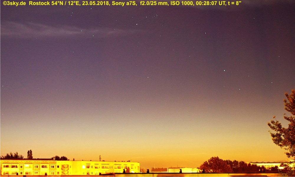 Max.-Höhe anfangs bei 2 bis vielleicht 2,5°, im späteren Abschnitt zum Ende hin gibt es noch einen kleinen "Sprung in die Höhe", wohl auf gute 3° über dem Horizont. Bei http://ed-co.net/nlcnet/pos15-may hatte ich damals zunächst nur 2° angegeben.
