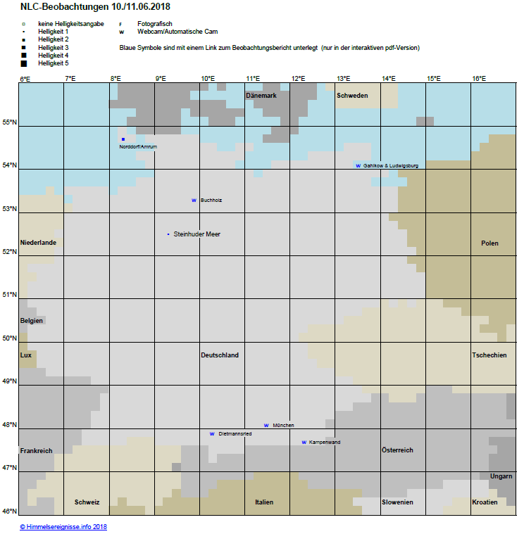nachdem OSWIN am 10.06.2018 bis nach 21 MESZ Echos gezeigt hatte, schien eine weitere NLC-Nacht so gut wie sicher. Bis dahin waren bereits in 8 Nächten Leuchtende Nachtwolken nachgewiesen worden, so viele wie nie zuvor in dieser frühen Saisonphase. Alle diese Displays waren jedoch ausschließlich nördlich des 54. Breitengrades an den Küsten von Nord- und Ostsee beobachtet worden. Dies änderte sich in der Nacht 10./11.06.2018, denn nun waren NLCs in ganz Mitteleuropa bis in den Alpenraum sichtbar (Abb. 1). Dass dennoch nur wenige Nachweise erfolgten (erneut hauptsächlich an automatischen Cams) ist den ungünstigen Wetterbedingungen geschuldet (Abb. 2, 3). Angaben zu Azimut und Höhe lieferten Jørgen K vom Steinhuder Meer für den Abendsektor und der Autor dieser Zeilen von Amrum für den Morgensektor. Die am Abend beobachteten NLCs (dunkelblaue Punkte in Abb. 4) standen mit ihrem Südrand vor der deutschen Küste. In Amrum wären sie fast im Zenit sichtbar gewesen, wenn es zu diesem Zeitpunkt dort nicht bewölkt gewesen wäre. Erst am Morgen klarte es auf der Nordseeinsel überraschend für etwa 45 Minuten auf. Zu diesem Zeitpunkt hatten sich die NLCs weit nach Norden zurück gezogen, sodass ihr Südrand nunmehr vor der norwegischen Küste lag (hellblaue Punkte in Abb. 4).
