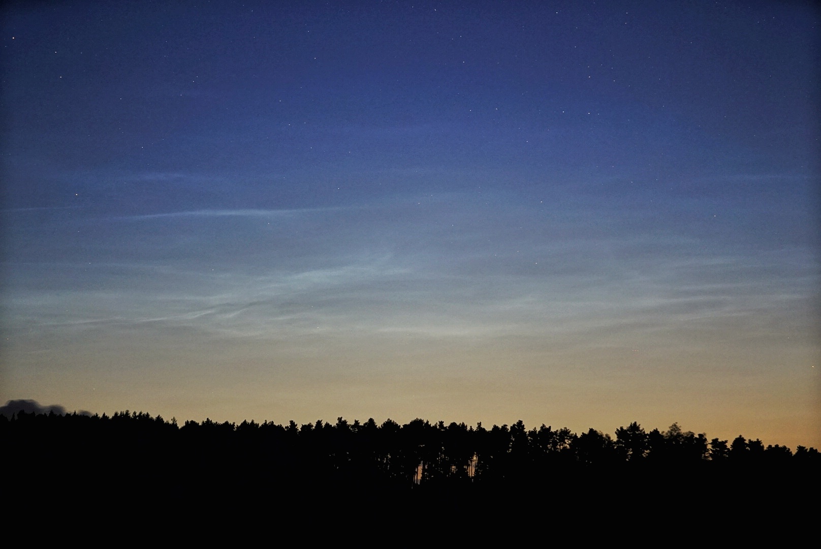 Der Himmel riss jetzt noch mal kurz auf, ein paar schwache NLCs sind im Fuhrmann immer noch vorhanden, Azimut 0° bis 20°, Höhe 9°, Helligkeit höchstens 1, mit bloßem Auge nicht zu erkennen.