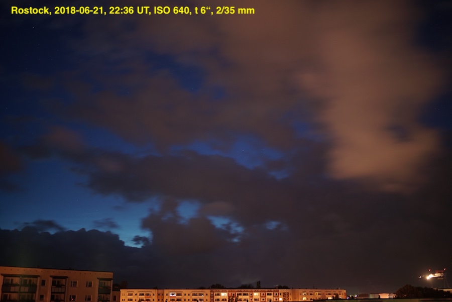 Immer wieder voller Hoffnung, doch die Wolken gewannen vermehrt. Ab visueller Kontrolle gegen 00 UT herum = 7Komma9 8tel. Wie die weiter laufenden Kameras zeigten, sollte das auch bis zum Ende der NLC-Nacht so bleiben.