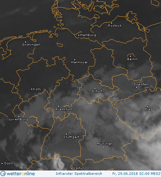 in der Nacht 28./29.06.2018 traten NLCs etwa ab der astronomischen Mitternacht in Erscheinung. Die vergleichsweise wenigen Nachweise (Abb. 1) verteilen sich auf die wolkenfreie (Abb. 2) Nordhälfte Deutschlands. Sowohl für 01:30 MESZ (Laboe bei Kiel) als auch für 02:31 (Lübbecke) liegen Angaben zu Azimut und Höhe der Leuchtenden Nachtwolken vor. Deren Südrand erstreckte sich von Schweden über Gotland in Richtung Kaliningrad. In der dort schon weit fortgeschrittenen Morgendämmerung gelang in Rostock um 03:15 MESZ eine weitere Positionsmessung. Zu diesem Zeitpunkt lag der Südrand des NLC-Feldes bereits bei Bornholm, also rund 300 Kilometer weiter südwestlich als noch 45 Minuten zuvor. Da eine solch hohe Zuggeschwindigkeit vielleicht nicht ganz unmöglich, aber doch eher unwahrscheinlich ist, waren hier wohl wie so oft vorher im Erdschatten liegende NLCs ins Sonnenlicht gelangt.
