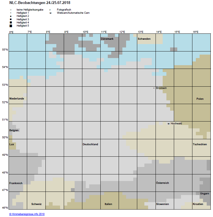 ein weiteres der für die zweite Julihälfte 2018 typischen lichtschwachen NLC-Displays trat in der Nacht 24./25.07.2019 auf. Es war offenbar nur kurze Zeit nach 3 Uhr MESZ im äußersten Osten Deutschlands sichtbar (Abb. 1). Diese geografische Einschränkung lag weniger an den Bewölkungsverhältnissen (Abb. 2) als an der extrem weit östlichen Position der Leuchtenden Nachtwolken über dem Baltikum (Abb. 3). Weiter westlich in Deutschland konnten sie sich nicht gegen den Horizontdunst durchsetzen.