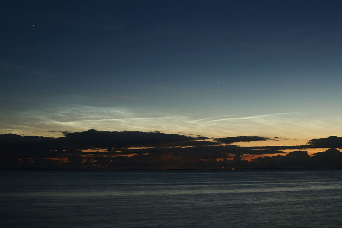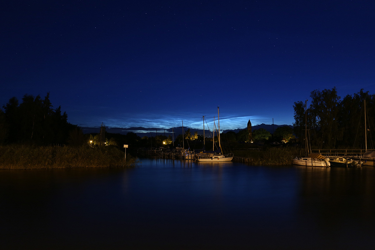 Ich habe die NLC erst etwas spät um 3:00 Uhr MESZ auf der Webcam in Gahlkow als feinen Strich über den Wolken gesehen und ein Blick auf die Webcam im Radisson Blu in Kopenhagen zeigte dort ein ziemlich ansehnliches Display, also hab ich mich auf mein Rad geschwungen und war um 3:30 Uhr in Greifswald am Ryck, wo ich die NLC schon gut mit bloßem Auge sehen konnte.