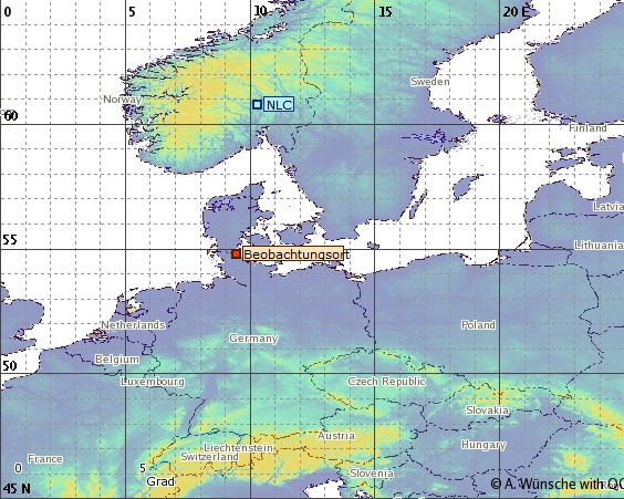 nachstehend der Vollständigkeit halber die Grafiken; auf einem Frame der Flensburg-Cam (https://www.foto-webcam.eu/webcam/flens ... 07/01/0110) befand sich der schwache NLC-Streifen in 4° Höhe und um Azimut 4°, woraus sich eine Position in der Gegend von Oslo ergibt.