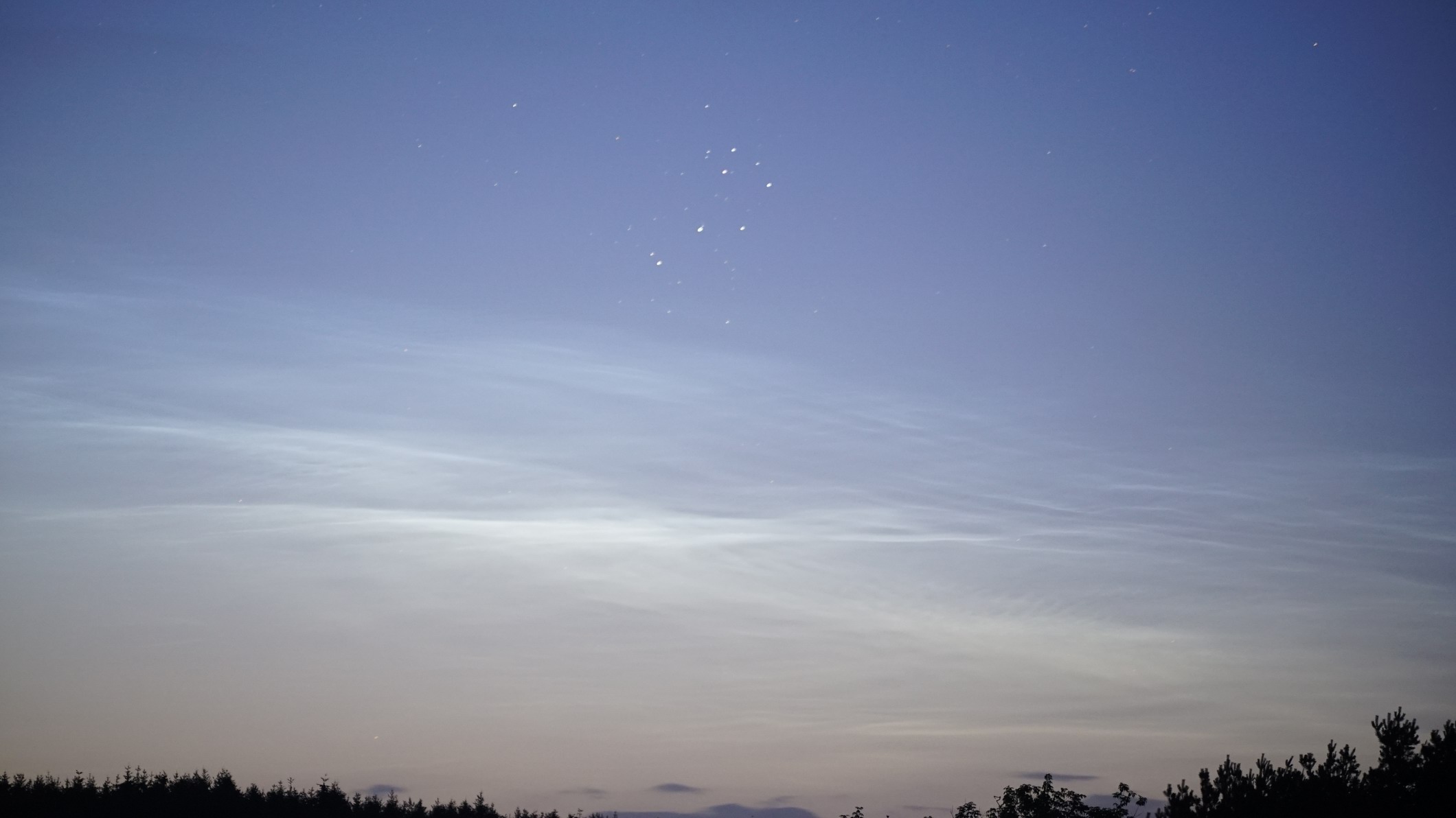bei meiner Sichtung von 23:28 MESZ (NLC Richtung NNO) bin ich mir nicht mehr so sicher, ob es NLC waren. Passt auch nicht zu der Beobachtung die ich 30 min später machte. Vor Ort waren die NLC tiefer und in Richtung NNO zogen dünne Zirren durch.