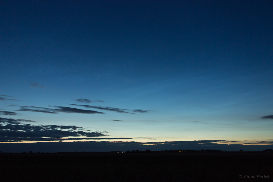 Hier mein Nachweis vom Abenddisplay, vom Morgendisplay bekam ich gegen Mitternacht wieder in Leipzig zurück, am Morgen dort aufgrund von sehr dichtem troposphärischen Gewölk über der Stadt bis auf einige wenige Streifen nur sehr wenig zu sehen. Beim ungewöhnlichen Abenddisplay hingegen hatte ich mit den Wolkenlücken mehr Glück. Bevor es von Westen her wieder zuzog, konnte ich noch einige Aufnahmen machen. Ungewöhnlich war das phasenweise unscheinbare, azimutal in seiner Ausbreitung großflächige und recht hoch reichende Display (> 20°, vgl. Talitha, Großer Bär) für mich deshalb, weil die NLCs vom Beobachtungsort gesehen so schnell wieder verblassten, wie sie anfänglich an Helligkeit gewannen. Aufgrund des Sonnenstandes hatte ich hier mit einer anderen Entwicklung gerechnet, zumindest bis nach 23 Uhr: