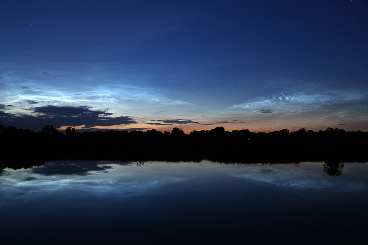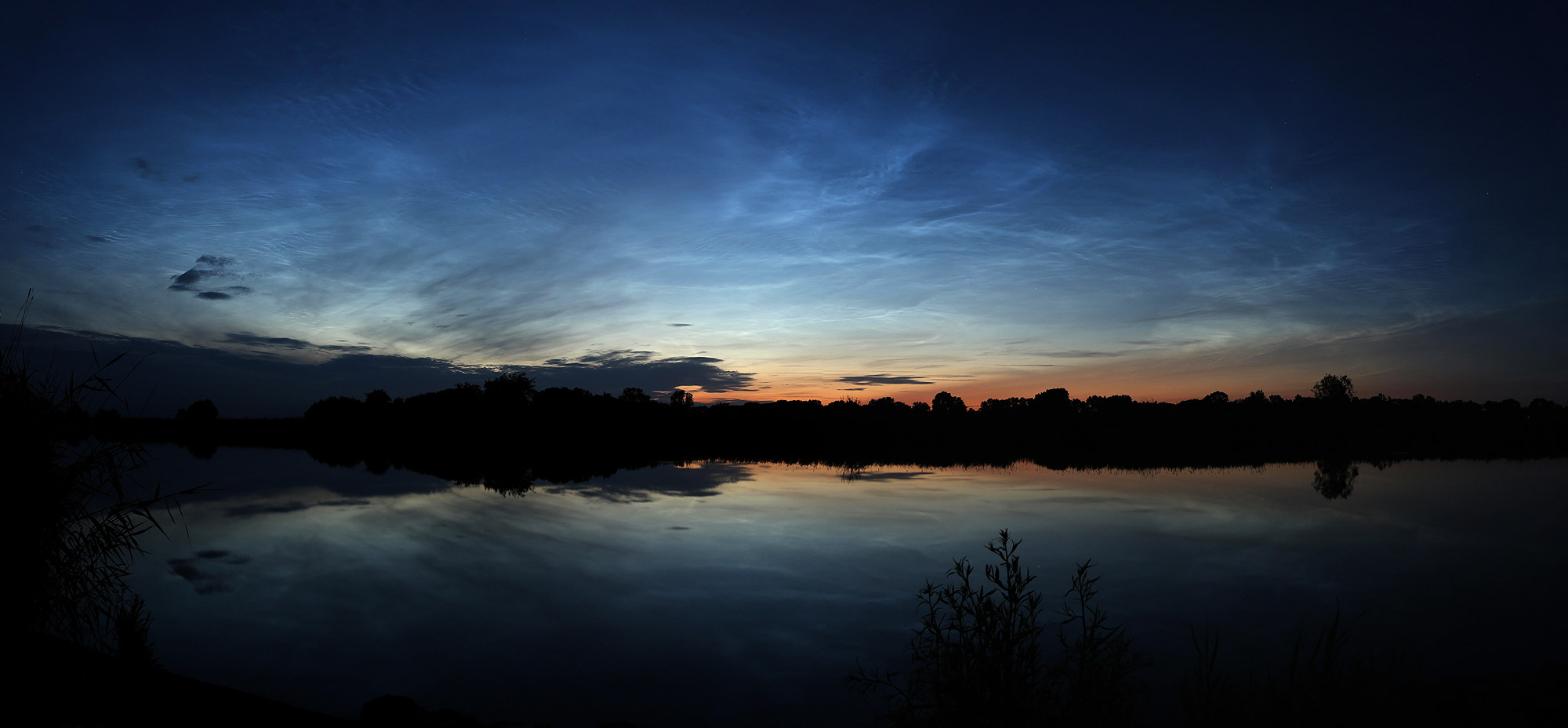 Ganz zu Anfang präsentierte sich mir ein schönes und gewaltiges Display leuchtender Nachtwolken, welches aber von Anfang an von einer Wolkenfront bedroht wurde. Zum Anfang gelang es mir, zwei funktionierende Panoramas der Leuchtenden Nachtwolken zu erstellen, welche beide etwa eineinhalb mal so breit sind wie ein normales Foto mit 24 mm am Kleinbild, die sichtbare horizontale Ausdehnung war also etwa 110 Grad. Die Höhe war auch ziemlich hoch, ging aber längst nicht bis zum Zenit.