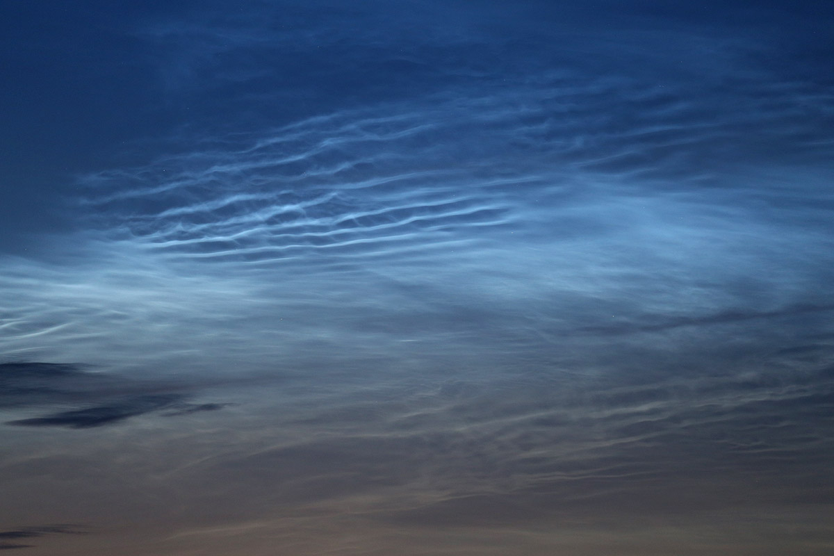 Die NLC in Nordost waren zu diesem Zeitpunkt noch sehr lichtschwach und gerade so noch visuell zu erkennen. Erst auf den Fotos zeigten sich die faszinierenden Strukturen. Diese Sorte hier nenne ich "Launcher", weil das so aussieht, als würde da Raketen abgefeuert. Gleichzeitig hat es aber auch etwas von Flügeln.