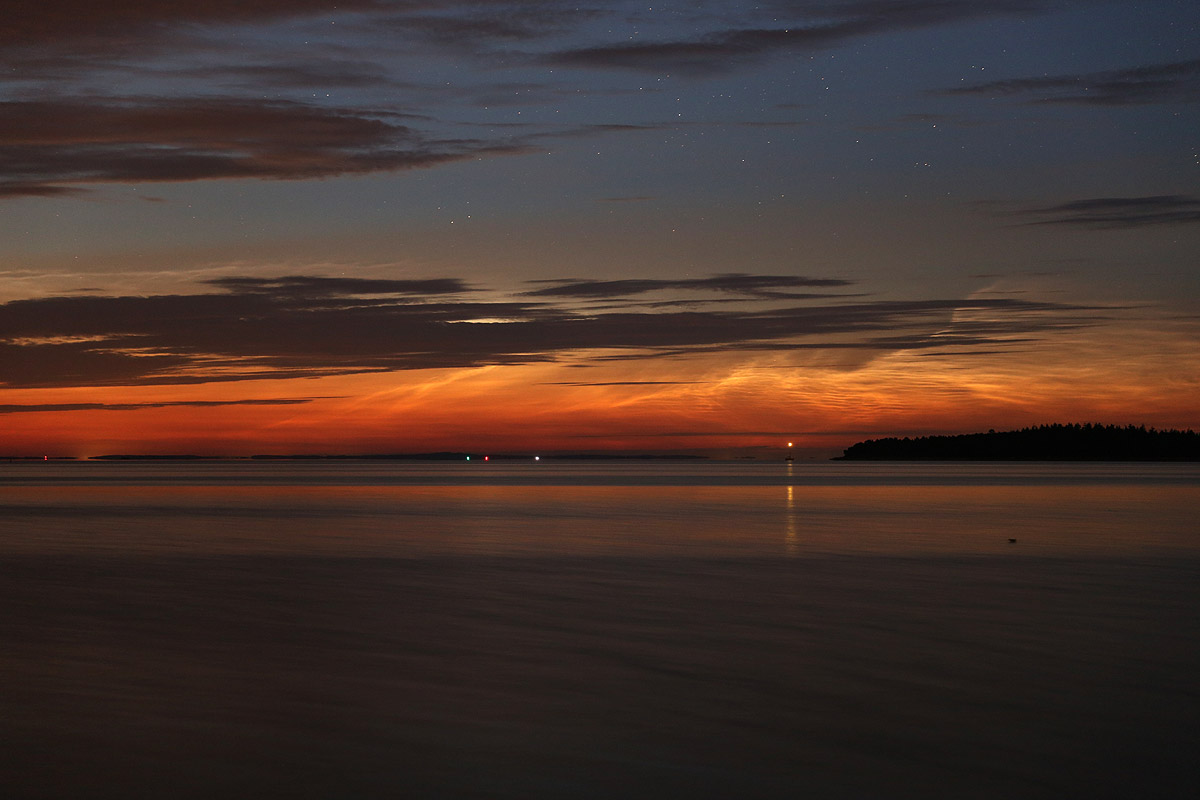 Bild 17: Die Boje unter den NLC, 200 mm, 15 Sec., ISO 3200, 02:40 Da die Wolken dann langsam aber sicher auch die letzten Reste NLC verdeckten, bin ich heim gefahren. Das Wetter war diesmal trotz der Wolken sehr angenehm, ich war nur Anfangs viel zu warm angezogen. Aber lieber mit der Daunenjacke bei angeblichen 22 Grad (Anzeige an der alten Brücke in Wieck) unterwegs als später den Kältetod sterben.
