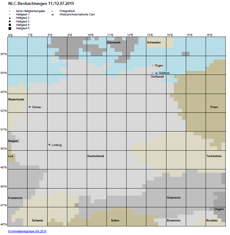 die NLC-Beobachtung in der Nacht 11./12.07.2019 litt sehr unter verbreiteter Bewölkung (Abb. 1), sodass nur wenige Nachweise erfolgten (Abb. 2).