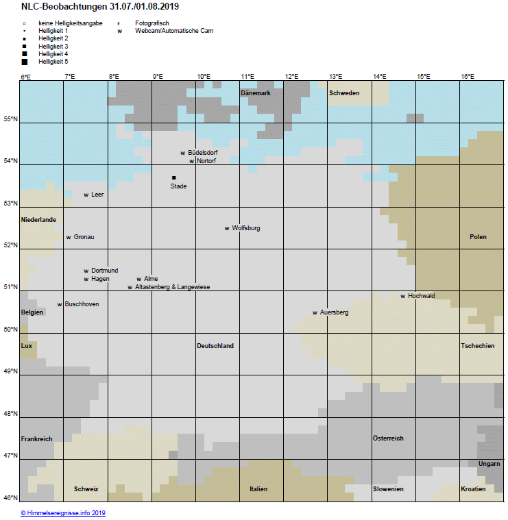 Hallo Christian. Das sind definitiv NLCs, herzlichen Glückwunsch zu dieser späten Sichtung. Kannst du Angaben zur Helligkeit der NLCs machen? Von visuell erfassbar (>0) gehe ich mal aus. Es wäre auch toll, wenn du deine Sichtung hier: http://ed-co.net/nlcnet/pos15-aug melden würdest. Die NLCs sind auch auf zahlreichen Webcams bis mindestens zum 50ten Grad nördlicher Breite hinunter (Auersberg) teilweise recht eindrucksvoll in Erscheinung getreten, insbesondere auf denen im Norden und Nordwesten Deutschlands wie beispielsweise Büdelsdorf, Nortorf, aber auch Hagen. Die von dir geschätzte Höhe könnte durchaus hinkommen, wenn man sich auch die Aufnahmen der beiden erstgenannten Webcams anschaut. Das Fragezeichen in der Betreffzeile kannst du aber auf jeden Fall entfernen. Hier die Webcams im DACH-Gebiet, die NLCs zeigen: