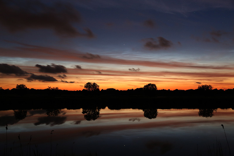 Normalerweise sind Cirren ja der Feind jeder NLC Beobachtung, da sie uns gerne mit Abschattungseffekten zum Narren halten, aber heute haben sie sich zusammen mit den Leuchtenden Nachtwolken und dem spiegelglatten Flüsschen Ryck zu einem sehr hübschen Motiv addiert. Die NLC reichten fast bis hinauf zu meinem treuen Sternchen Capella.
