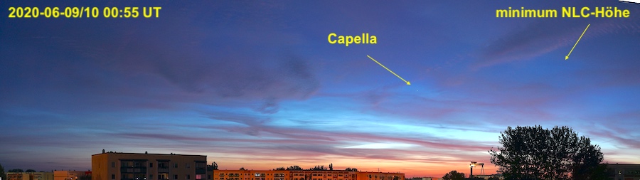 Die NW-Kamera (EOS 600D + 2/35mm + Astroklarfilter) lief von 20:55 - 01:05 UT mit NLC gesichert ab 22:20 UT bis max. West-AZI 320 (abend) und 315 (morgens).