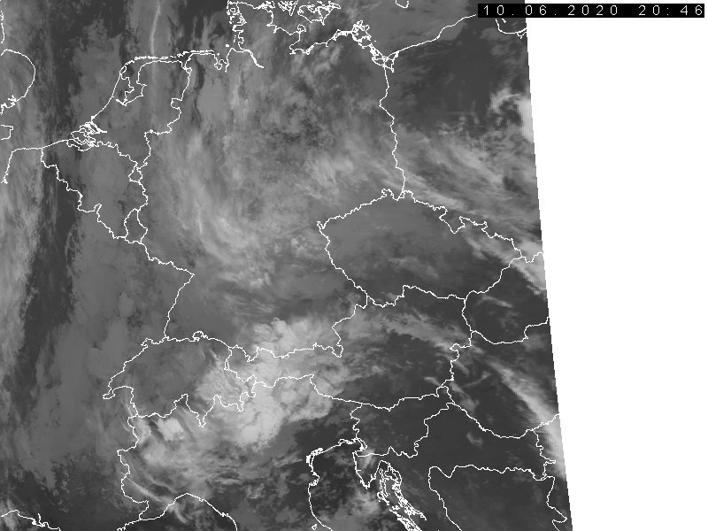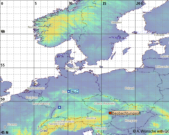 In der D/A/CH-Region erlaubten nur ganz vereinzelt (Abb. 1) Wolkenlücken (Abb. 2) einen Blick auf das Geschehen. Die relativ besten Bedingungen herrschten im Osten Österreichs. Dort nahm Wolfgang Vollmann um 22:32 MESZ ein Foto auf, an Hand dessen sich die Position (der Oberkante) der in Wien sichtbaren NLCs bestimmen ließ. Diese erstreckte sich etwa zwischen Heidelberg und Göttingen (Abb. 3).