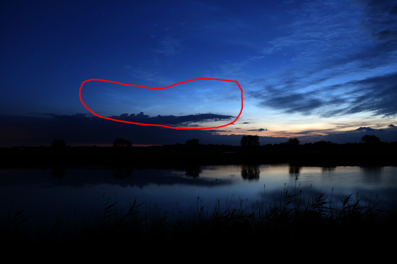 Mit der Hoffnung, dass sich die starken Signale, die Oswin detektiert hat auch in NLC's müden bin ich gegen 21:30 UTC 'rausgefahren. Zu diesem Zeitpunkt zeigte auch die Wolkendecke Richtung NW deutliche Lücken. Der Sektor von 0°N bis Osten war wolkenbedeckt. Die Wolken hielten sich leider hartnäckig.