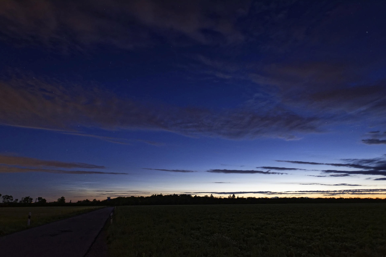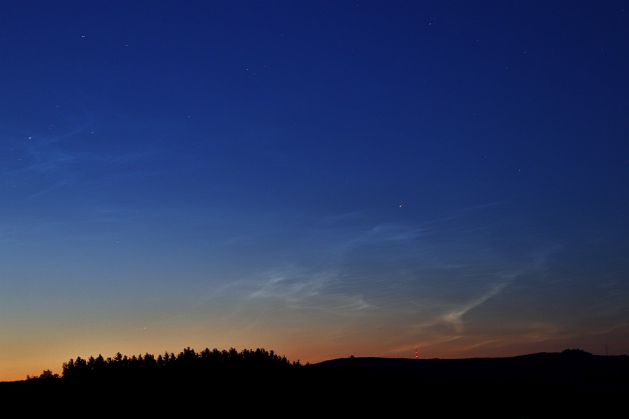 auch ich war dank des extrem klaren, sprich transparenten Himmels wieder auf dem Landberg und glaubte nicht daran, NLCs zu sehen. Erst mit recht tiefem Sonnenstand wurden die schwachen Felder bei Capella sichtbar. Weit östlich stand ein helleres und größeres Feld… Fürs Morgendisplay (falls vorhanden) wird mir die Zeit fehlen, da noch kein genehmigter Sommerurlaub im Kalender steht…