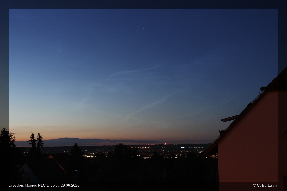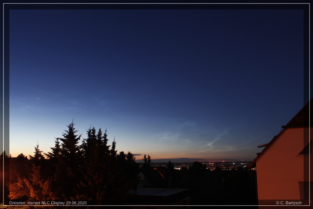 im Norden war von Dresden aus schwaches NLC Feld zu sehen. Der östliche Ausläufer mit seinem hellen Band schätze ich auf Helligkeit 2, der Rest im westlichen Bereich eher Helligkeit 1-2 (visuell noch sichtbar). Der westliche schwache Teil erreicht für mich etwa 25° Höhe (knapp unterhalb der Höhe von Kassiopeia), Ausdehnung von etwa Insgesamt 60 Grad Bereite ( 25 Grad Ost bis 325 West). Bis 23:30 Uhr zunehmend schwächer, blasser und zum Horizont hin näher. Viele Grüße
