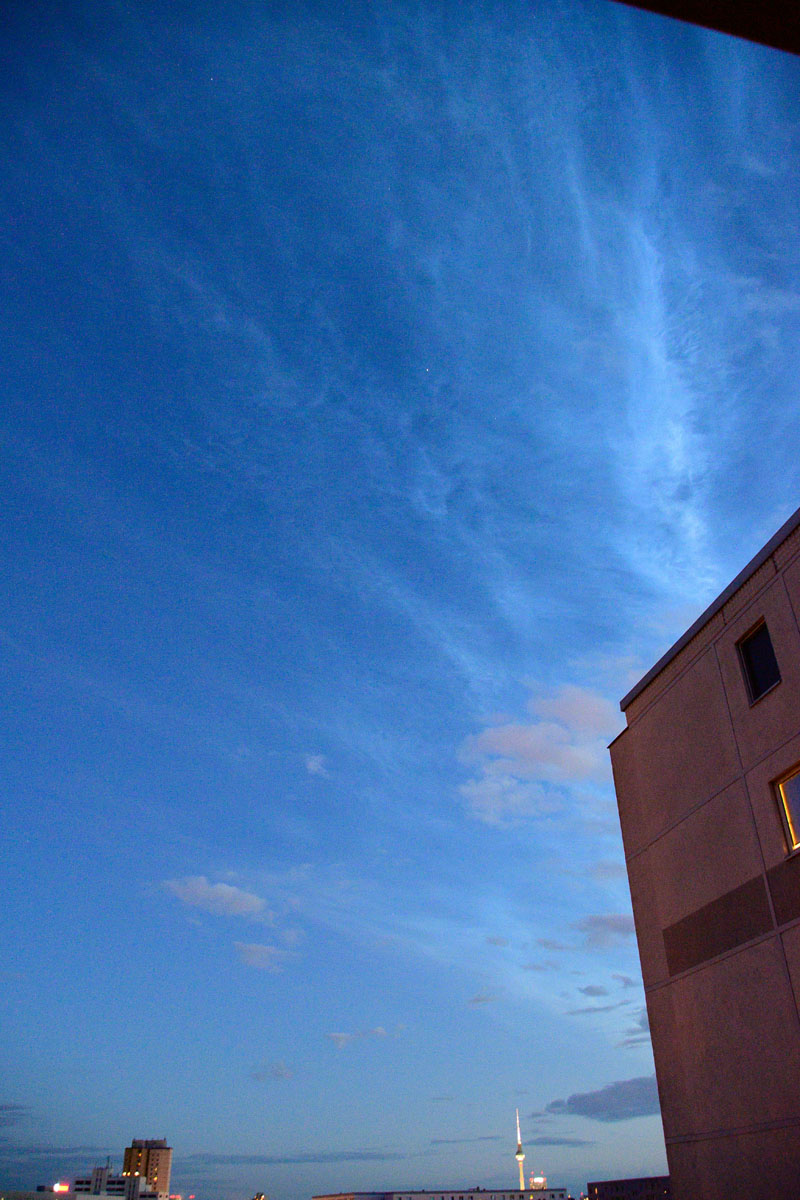 nachdem ein Kollege (Mario, bist Du das?) mich netterweise per Handy auf die NLCs hingewiesen hat, konnte (und kann) ich sie vom südlichen Berlin aus auch beobachten. Allen, die sie schon zu Gesicht bekommen haben, Glückwunsch; allen anderen Dauem drücken, dass sich die Wolken verziehen. Hier hat es hinter der Kaltfront (die für einen schönen doppelten Regenbogen gesorgt hat, der aus erhöhter Position auch unterhalb der Horizontlinie zu sehen war) gut geklappt .