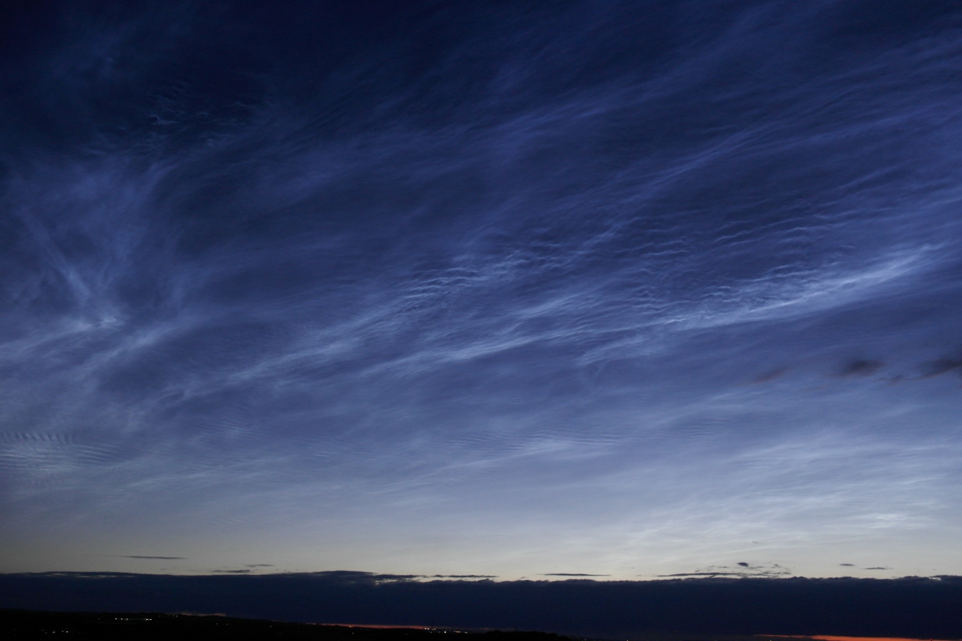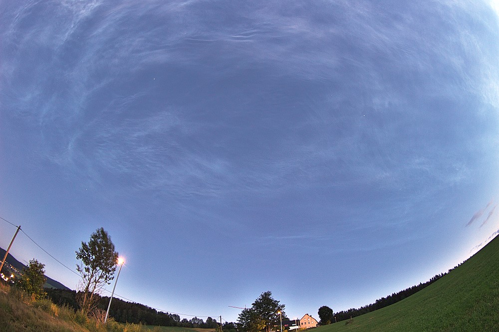 Was bitteschön war das? Da hat man ja nicht mal mehr Zeit, zum Beobachtungsplatz zu fahren und dann erwarten einen 6/8 NLC über den Zenit bis 30° über Südhorizont. Und das auf 50° 33′ N! Was kommt als nächstes? NLC mit Sonnenbrille????? Leider ist es jetzt zugezogen. Hier die ungefähren Daten:
