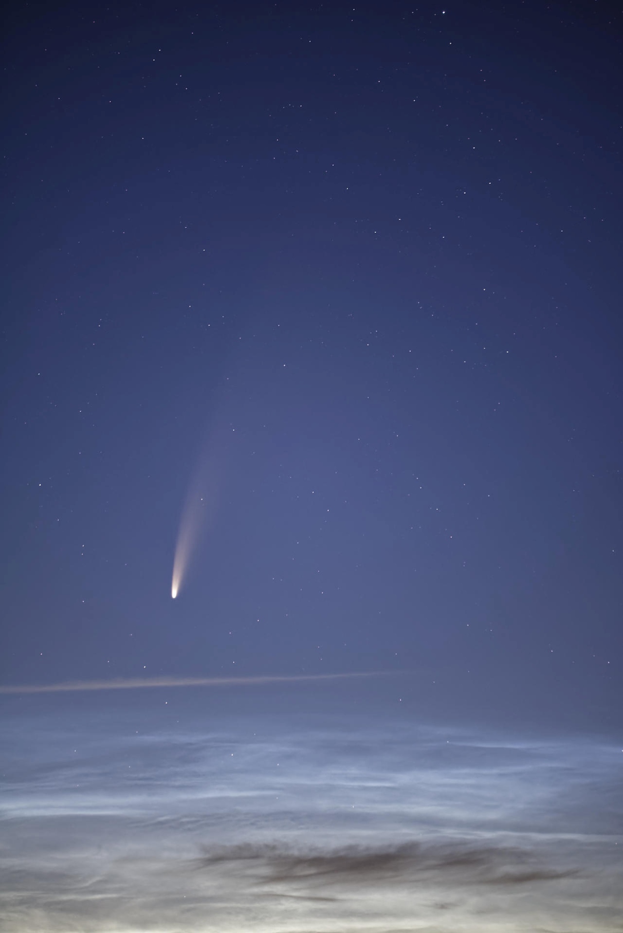 Mittendrin wieder Neowise. In den (eigentlich überhaupt nicht dichten) Schwaden der NLCs ist das mit der photographischen Abbildung allerdings eine echte Herausforderung, die ich hier eher "künstlerisch" angegangen bin!