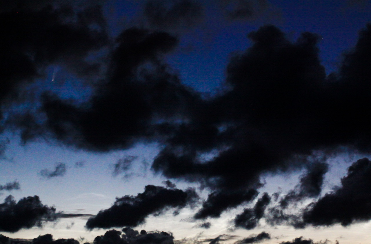 Nachtrag von 00:30 MESZ: Die Nachtwolken haben sich jetzt zum Horizont zurückgezogen und erreichen kaum mehr als 3 Grad Höhe. Dafür ist Komet Neowise nun besser zu sehen, da der Himmel etwas dunkler geworden ist.