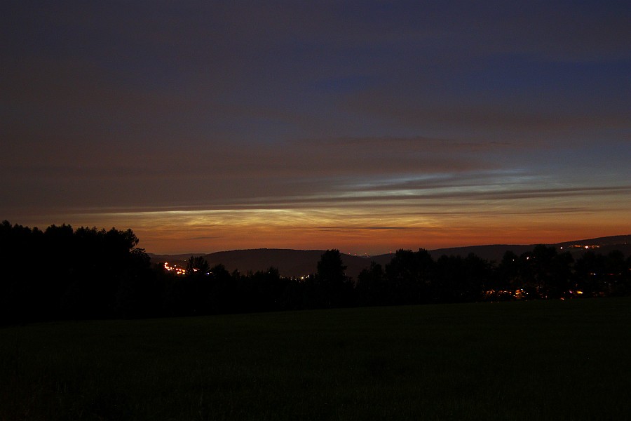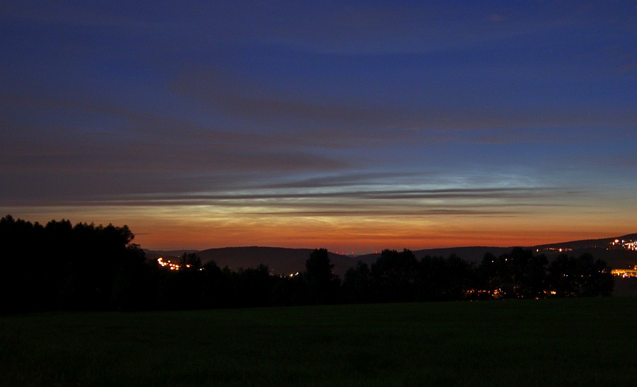 Ich hatte dank des sehr transparenten Himmels wieder auf dem Landberg Platz genommen und schaute beharrlich nach Norden. Nach Sonnenuntergang wurden zu meinem Erstaunen die ersten NLCs weit im WSW sichtbar, bei 240° Azimut!