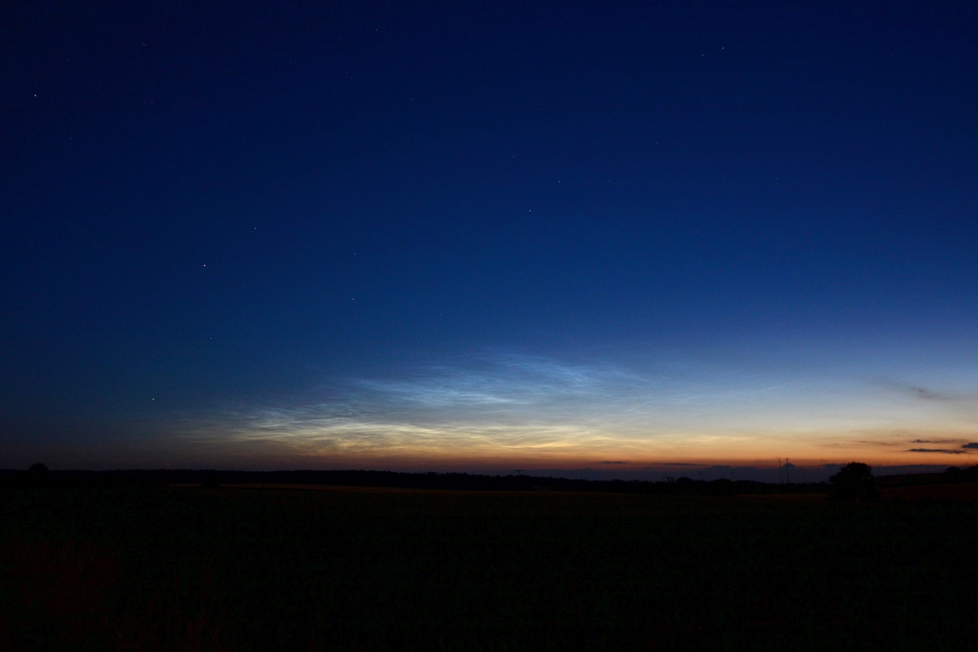 Gestern am 20.Juni waren keine NLCs am Nordrand von Wien zu sehen. Heute 21.Juni zog im Süden ein Gewitter auf, im Norden gab es eine Wolkenlücke mit NLCs. Sie waren mit freiem Auge nur als sehr blasse Aufhellung zu sehen, am Foto ist das viel deutlicher: