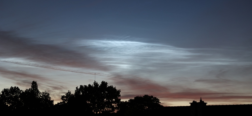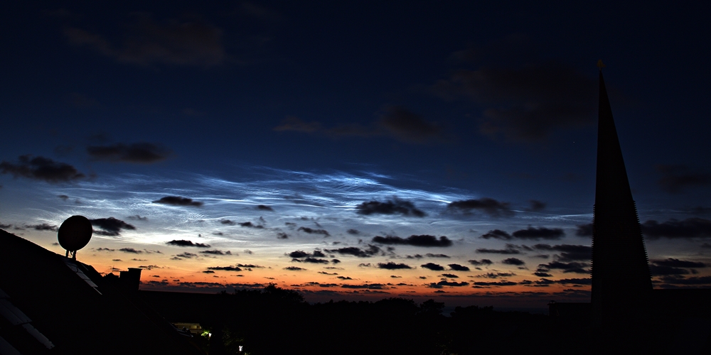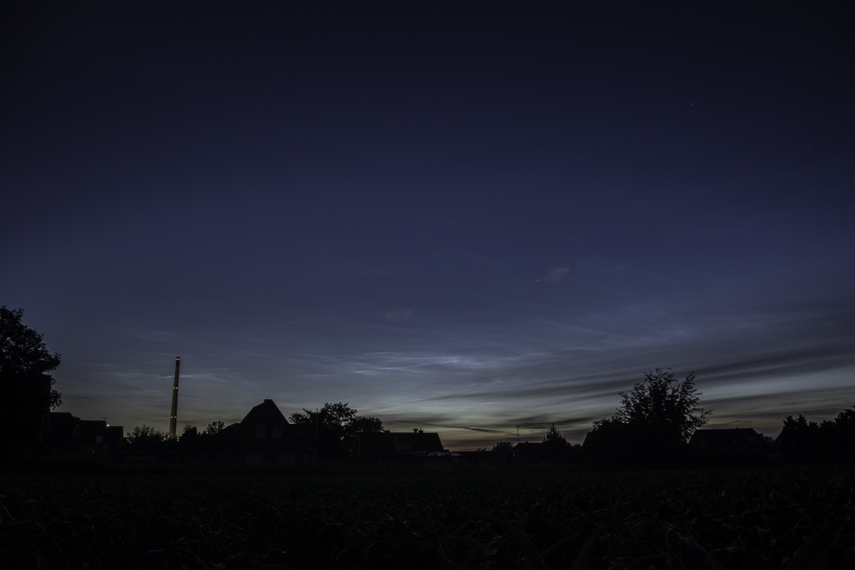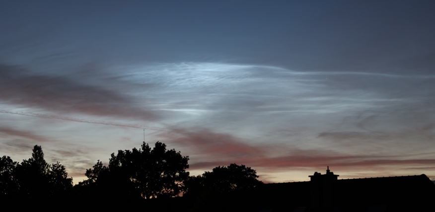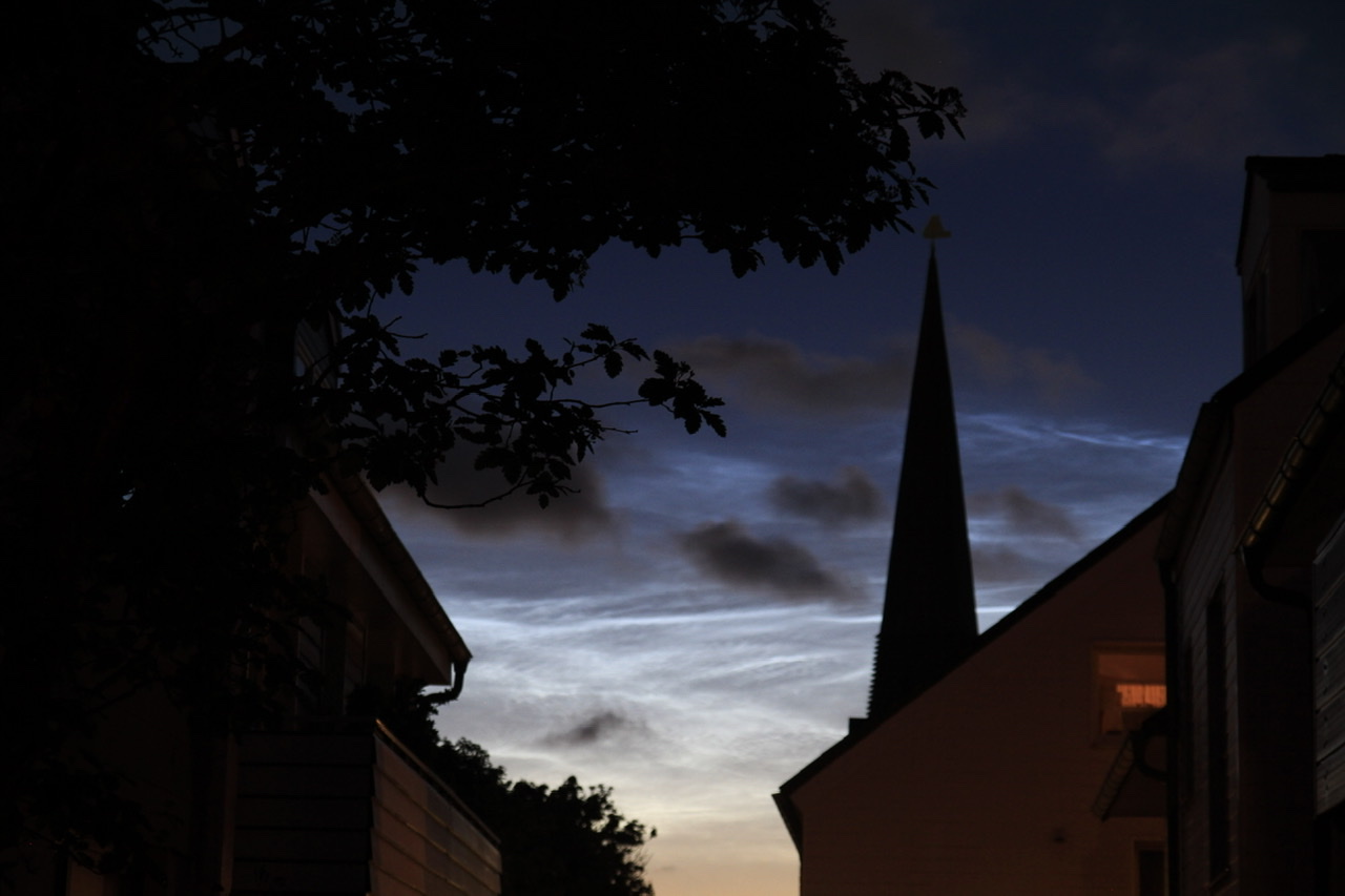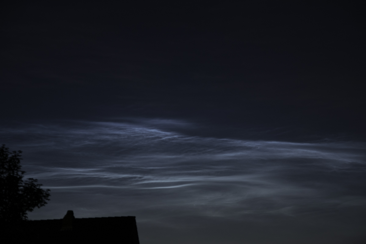ich konnte nun auch endlich meine erste NLC-Sichtung in dieser Saison machen. Etwas überraschend klarte sich im südlichen Schleswig-Holstein der Himmel gegen 23:15 MESZ von Nordwesten her (fast) auf, so dass sich die angekündigten NCLs zeigen konnten. Ich habe auf die schnelle nur aus unserem Dachfenster fotografiert, die Fotos sind nur beschnitten und verkleinert, ansonsten unbearbeitet.