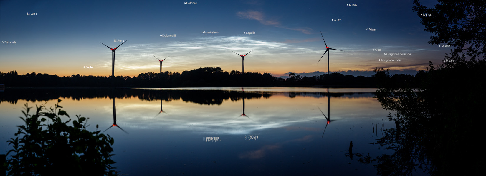 Am Ende landete ich in der Nähe von Bargstedt. Die NLC waren immer noch vorhanden, aber bei weitem nicht so hell wie am Abend. Sie erstreckten sich von NW bis NO. Und in diesem Panorama von 02:51 MESZ reichten sie bis etwa 15° hoch. Insgesamt eine tolle Stimmung mit flachen Nebelfeldern!