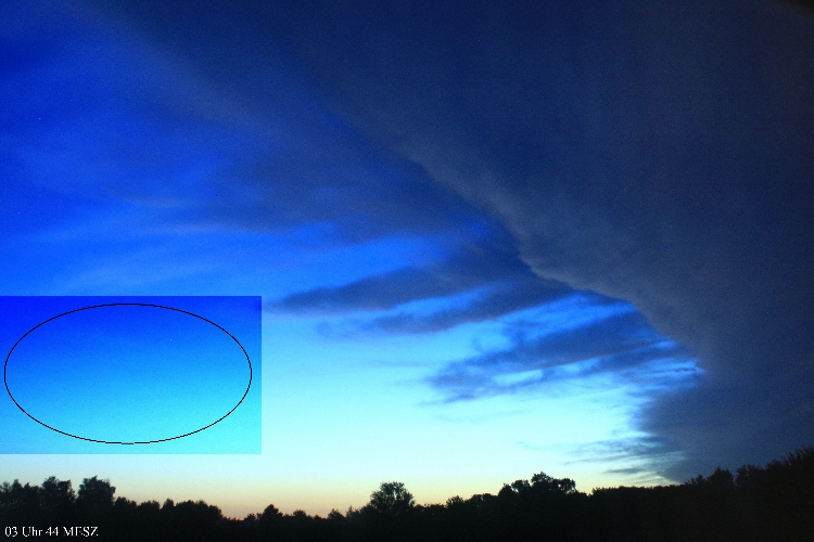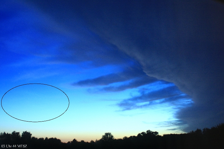 Zudem stelle ich fest, dass auf drei Ausgabegeräten (Laptop, Monitor, Handy) die NLCs mal besser, mal gar nicht zu sehen sind. Sie waren aber da... Durch die Reihenaufnahmen der Canon 40D ist sehr schön die Zugrichtung zu sehen... Sie (die nördlichen NLCs) ziehen nach Westen oder WSW, die NNO-NLCs ziehen nach Süden und das troposphärische Gewölk kam aus SSW und zog nach NNO...
