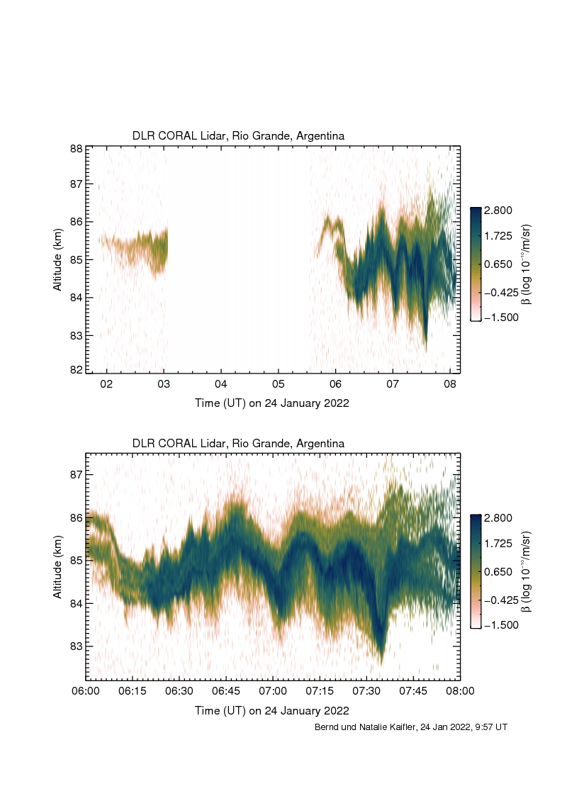 In der Folge entwickelte sich eine spektakuläre Show, bei der die NLCs weit nach Norden zogen. Einen frühen Nachweis erbrachten dabei bereits die Messungen des Coral-LIDARs vom DLR in Río Grande. Man war also frühzeitig vorgewarnt. Der Plot mit den Messergebnissen wurde freundlicherweise von Frau Dr. Kaifler zur Veröffentlichung hier zur Verfügung gestellt.