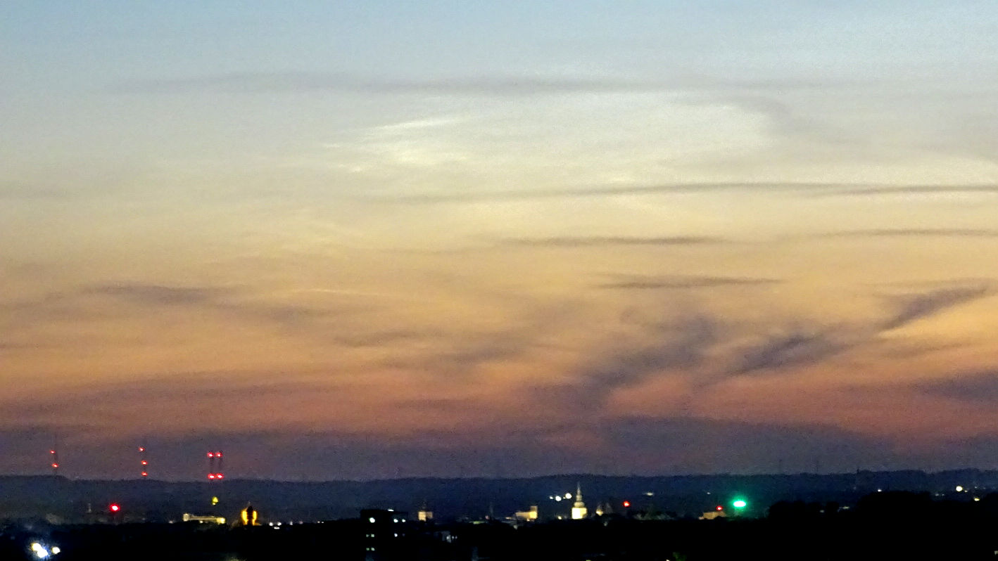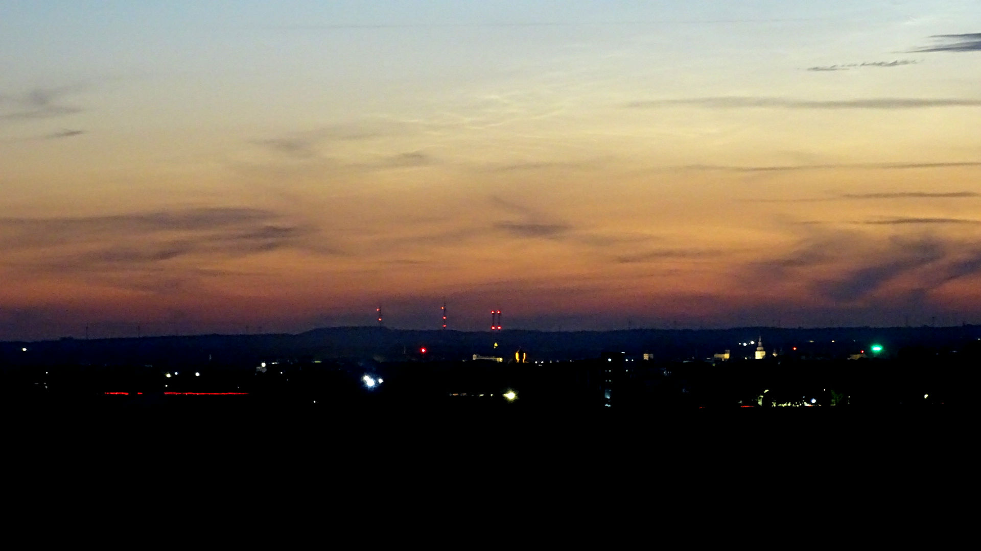 Oswin war tagsüber schön aktiv und zu den Abendstunden verzogen sich dann auch noch die Wolken. Also bin ich rausgefahren und konnte schon kurz nach 23 Uhr MESZ eine Aufhellung in Richtung Westen mit bloßem Auge ausmachen. Fotografisch waren die Strukturen erst einige Minuten später klar als NLC erkennbar. Viel mehr wurde es aber auch nicht. Die Riffeln waren zwar mit dem bloßen Auge erkennbar und unterscheidbar, aber die Helligkeit des westlichen Feldes würde ich eher mit H1, kurzzeitig H2, bezeichnen.