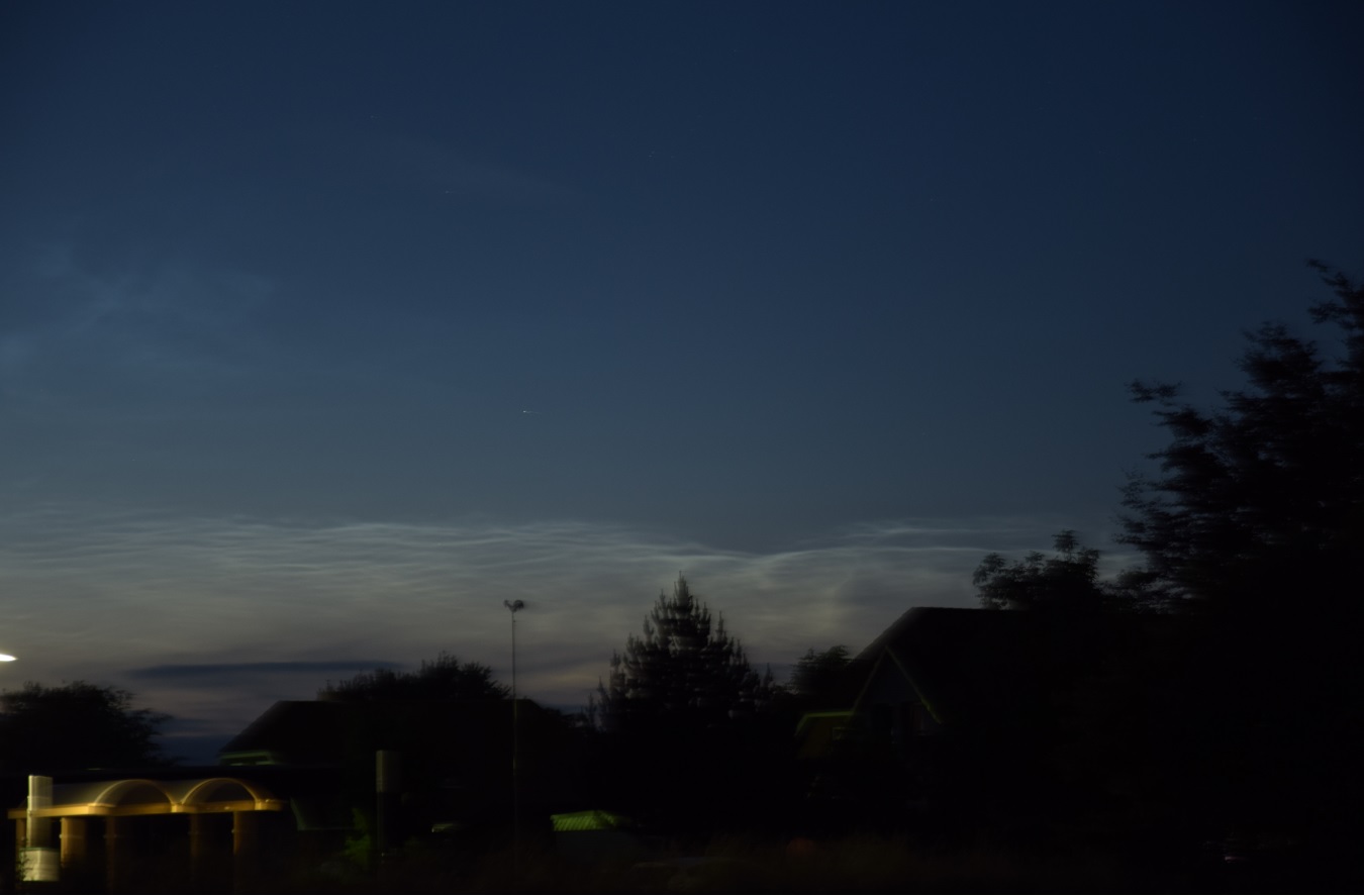 auch aus Wardenburg konnte ich die NLC beobachten. Ab ca. 23:30 Uhr MESZ ließen sich feine Strukturen etwa in Richtung 35° ausmachen. Die Höhe betrug nur wenige Grad, sie reichten knapp über die entfernten Baumwipfel. Die Helligkeit war zu dem Zeitpunkt mit H1 einzustufen.