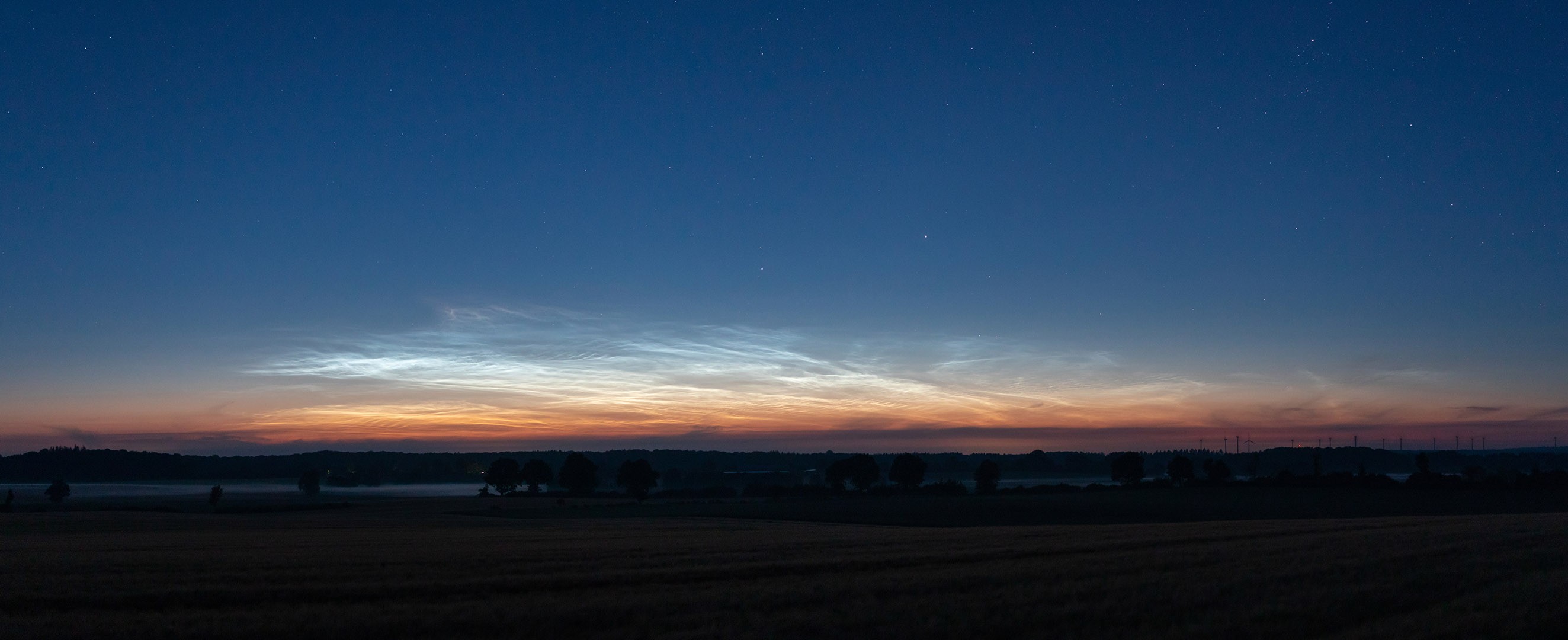 ich war nach Mitternacht in der Nähe von Talkau und konnte die NLC von dort sehr schön beobachten. Sie erreichten zwar keine große Höhe über dem Horizont, erreichten aber Helligkeit 3. Zum Morgen hin baute sich das ganze ab und ich beendete die Beobachtung gegen 2:30 MESZ. Schön waren die im Tal wabernden Nebelfelder-