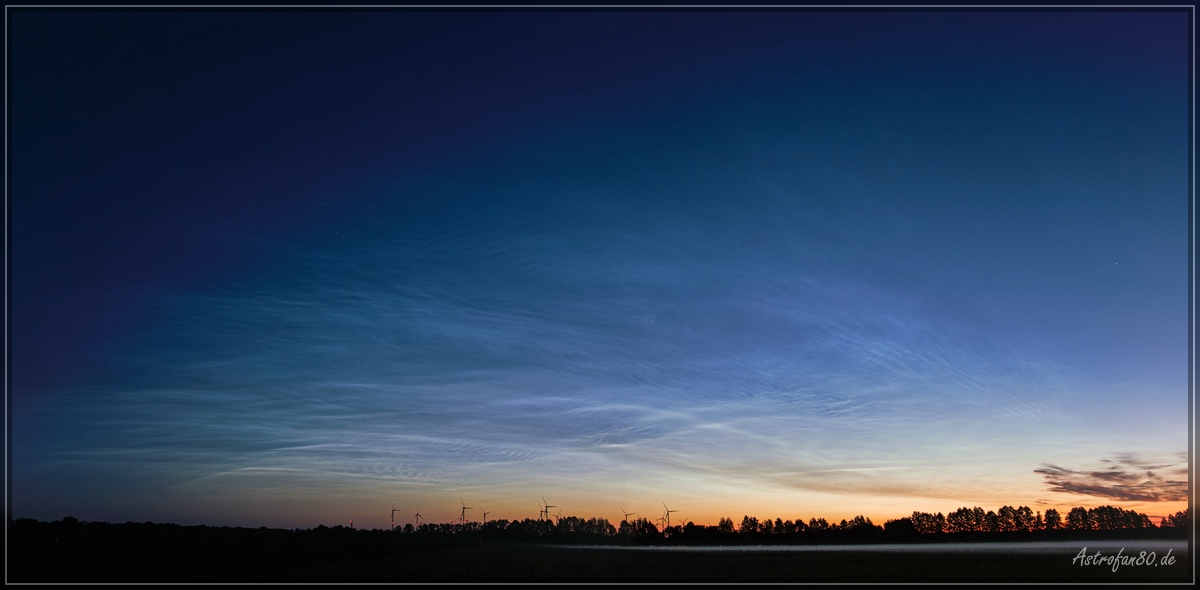 Ich war gestern Abend zunächst wegen aufziehender Wolken etwas westlich von Hamburg, von wo die NLC auch schon recht gut zu sehen waren. Dann zog es sich jedoch zu. Nach kurzer Pause zu Hause bin ich - weil die Wolken laut Satellitenbild abziehen sollten - in die Nähe von Braak knapp östlich von Hamburg gefahren. Was dann kam, war einfach nur wundervoll. Hier eine Auswahl von Bildern und Panoramen: