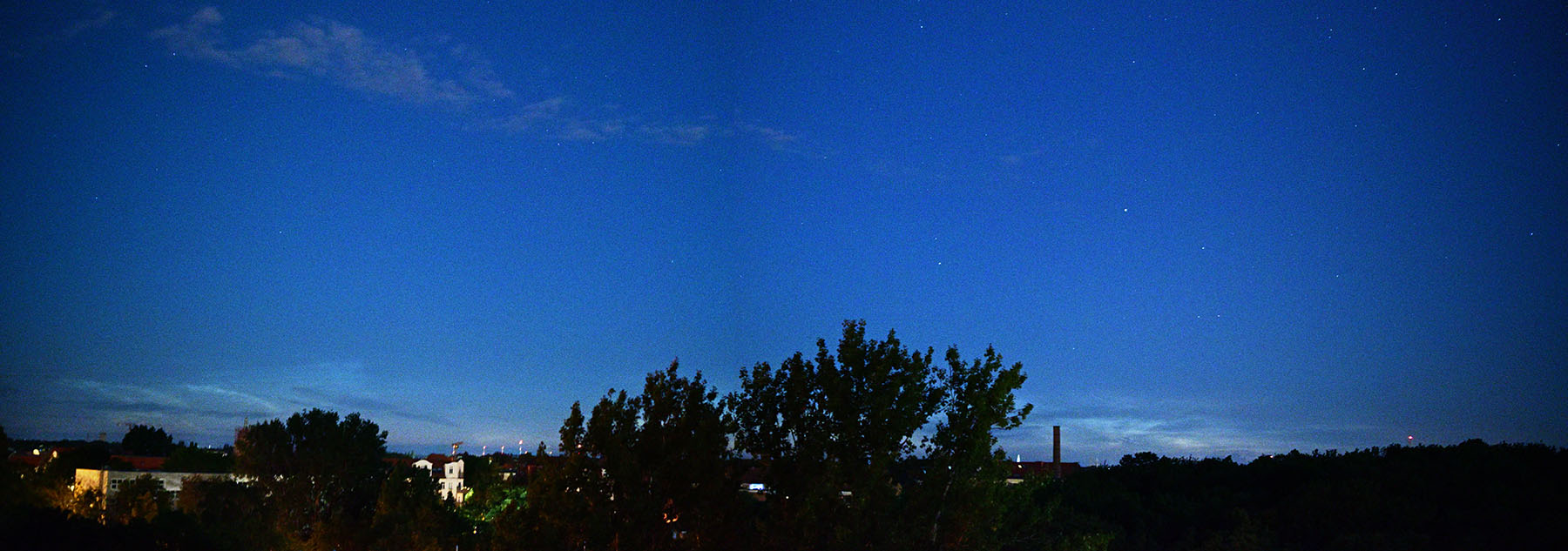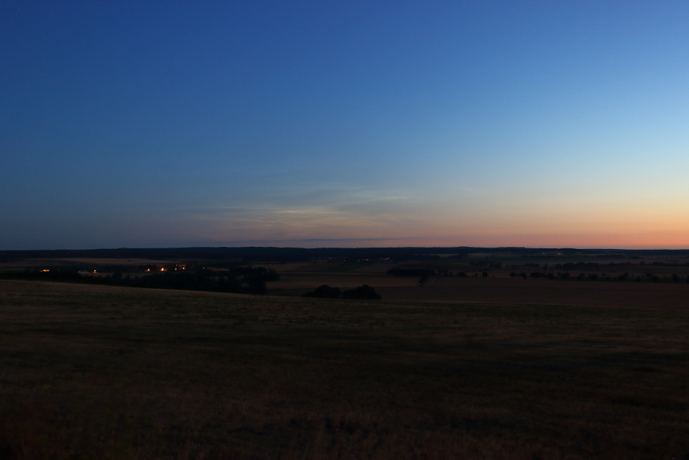 Mittlerweile verblasste das östliche NLC-Feld zusehends, während das westliche Feld die Hauptrolle einnahm und immer noch mit einem roten Saum an der Westflanke strahlte. Der Sonnenstand hier mittlerweile bei -10,2°: