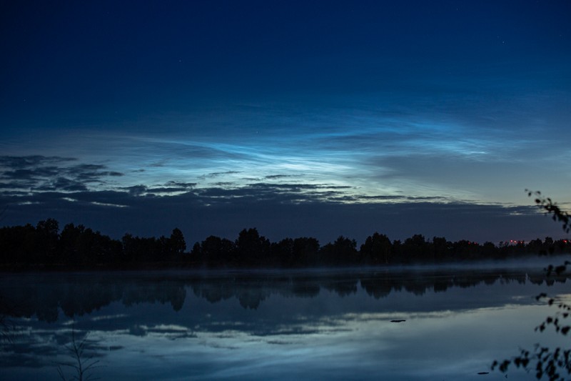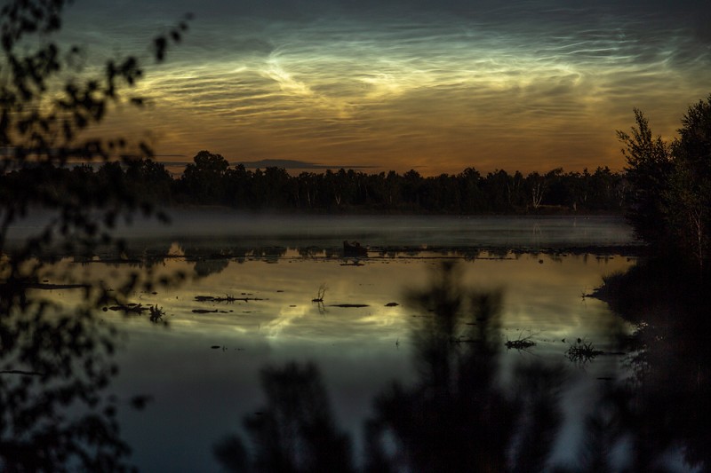 Froschkonzert, kalte Nebelschwaden (ja, nur im Flanellhemd war es wirklich kalt) und Rufe verschiedener Wildtiere, die teils so exotisch klangen, dass ich sie nicht zuordnen konnte. Dazu der Geruch von nassem Sand und feuchtem Torf. Im Verlauf der Beobachtung schien sich mir ein Tor zu öffnen, bestehend aus den Flanken der zwei (mittlerweile hellen) NLC-Felder am Horizont, samt Spiegelung im Wasser, was einmal mehr beeindruckend wirkte: