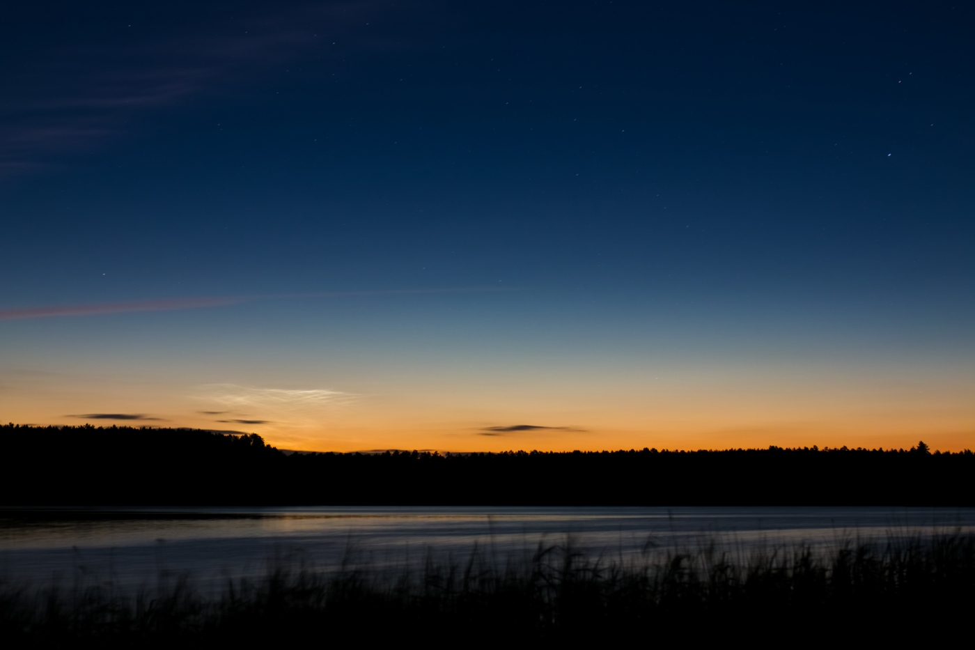 Am Großen Brückentinsee (53.2554N, 13.2424E) angekommen, blies auf der Holzbrücke ein kalter Westwind durch die orografische "Düse" zwischen Südufer und Insel. Ungemütlich! Gegen 1:40MESZ zeigte sich eine ganz leichte Aufhellung in NNO. Ein Blick durch's Fernglas bestätigte den Verdacht: Leuchtende Nachtwolke! Visuell ahnbar, marginalst, bei Sonnenstand -15.3°. Danke Andy für die zusätzliche Bestätigung per SMS, aus diversen Kamerabildern.