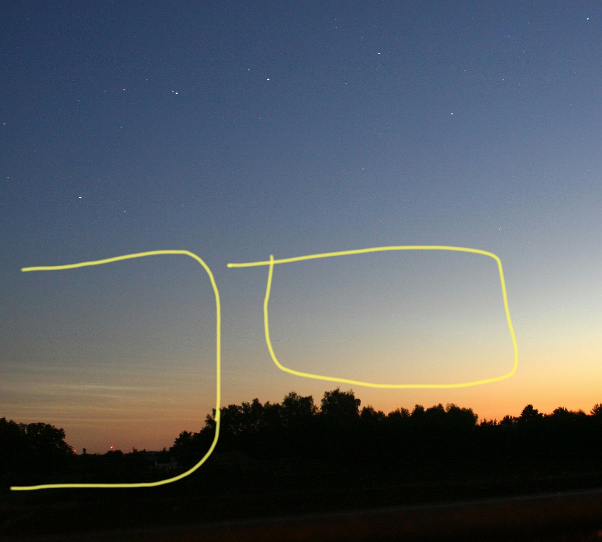 von Hamburg aus konnte ich zwischen 4:15 und 4:30 MESZ ein Feld schwacher NLC tief im Nordosten aufnehmen. Die maximale Höhe in der bearbeiteten Version ist knapp 10°. Horizontale Ausdehnung von 12 bis 34°, das ist zumindest der von mir einsehbare Bereich. Visuell konnte ich die NLC schwach wahrnehmen.