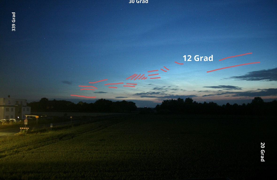 Die Höhe der morgendlichen NLCs ist für mich zuletzt um 03:20 MESZ (Sonnenstand bei -10,4°) nachzuvollziehen gewesen: Hier erreichten die Strukturen eine Höhe von ca. 16° am Nordhorizont. Ich gehe davon aus, dass die NLCs noch etwas höher gestiegen sind, was auch auf den frames der deutlich weiter südlich gelegenen (!) Ettelsberg-Webcam nachzuvollziehen ist.