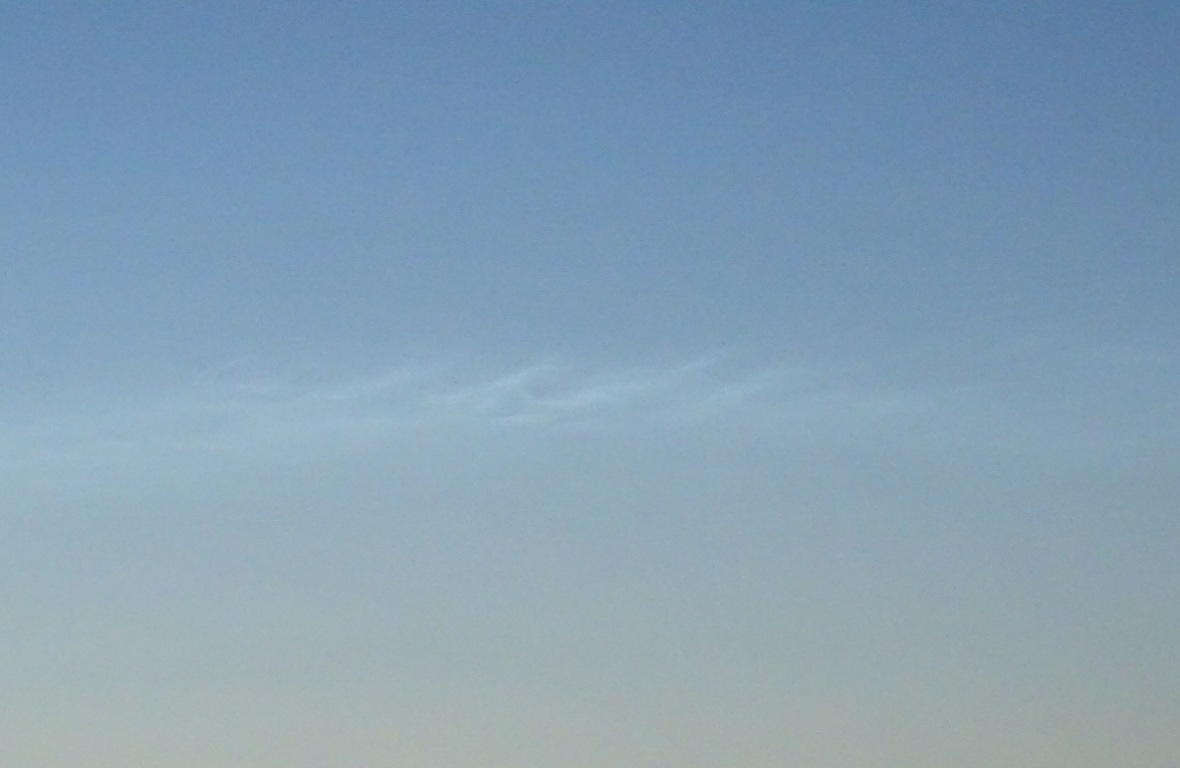 Mit dem bloßem Auge waren keine Strukturen zu erkennen, mit der Kamera ließen sich aber schöne Wellenformen festhalten. Eine halbe Stunde später deutete sich links davon ein Streifen an, der zuerst nur schwer von dem Dunst zu unterscheiden war. Mit der Kamera ließen sich aber auch hier feine Wellenstrukturen und Bewegungen nach Westen festhalten, sodass es sich hier auch um NLC gehandelt haben muss und kein "Schnodder" oder Kontrasteffekt war, der sonst den Horizont eintrübte. Der Streifen war dann auch noch zu erahnen, als die östlichere Struktur schon fürs Auge nicht mehr sichtbar war. Etwa gegen Mitternacht waren dann beide Formationen nicht mehr mit dem Auge auszumachen.